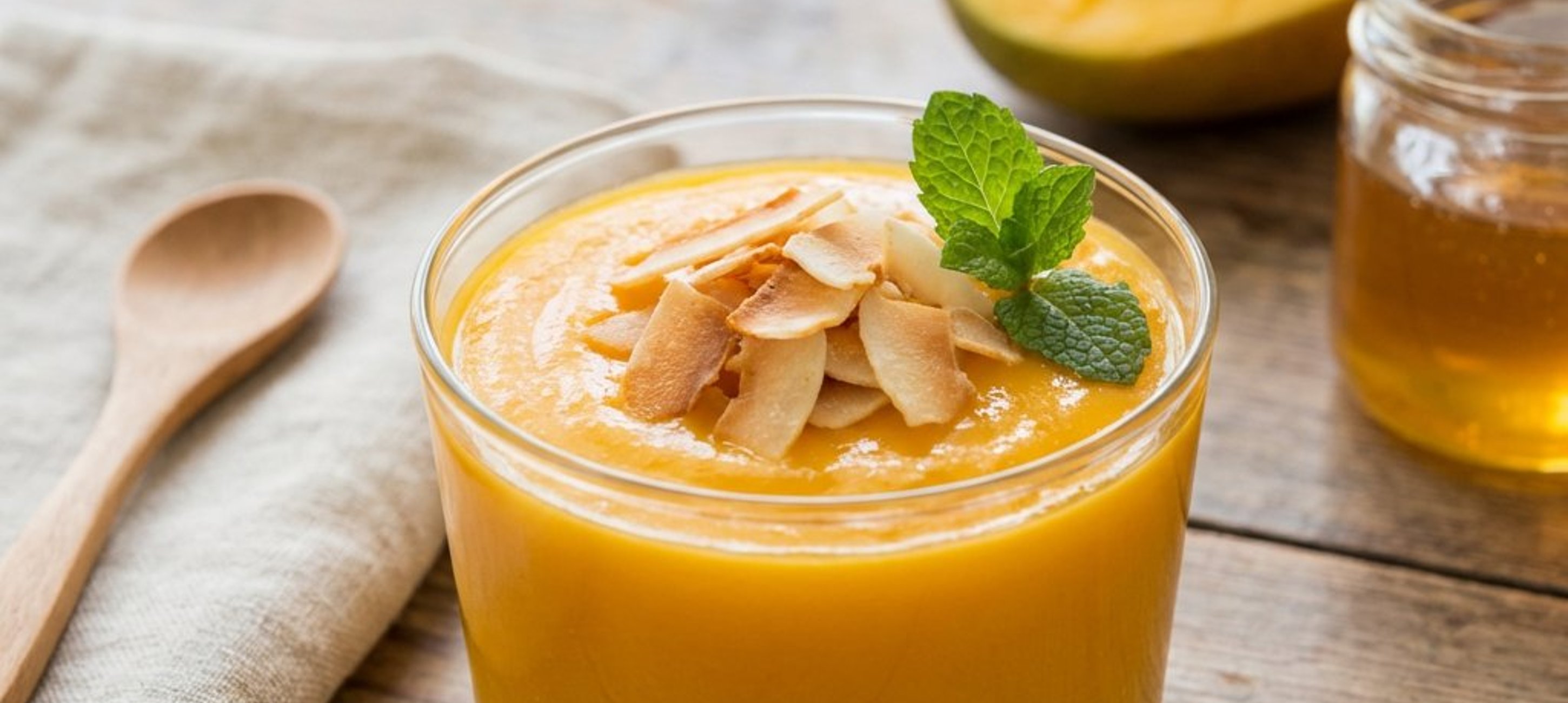 - 2In der Zwischenzeit die Mangos schälen und den Kern entfernen. Das Fruchtfleisch zusammen mit 100 ml Wasser im Mixer glatt pürieren. Die Mangomischung in einen Topf geben, Kokosmilch und Honig hinzufügen und alles bei mittlerer Hitze zum Kochen bringen.