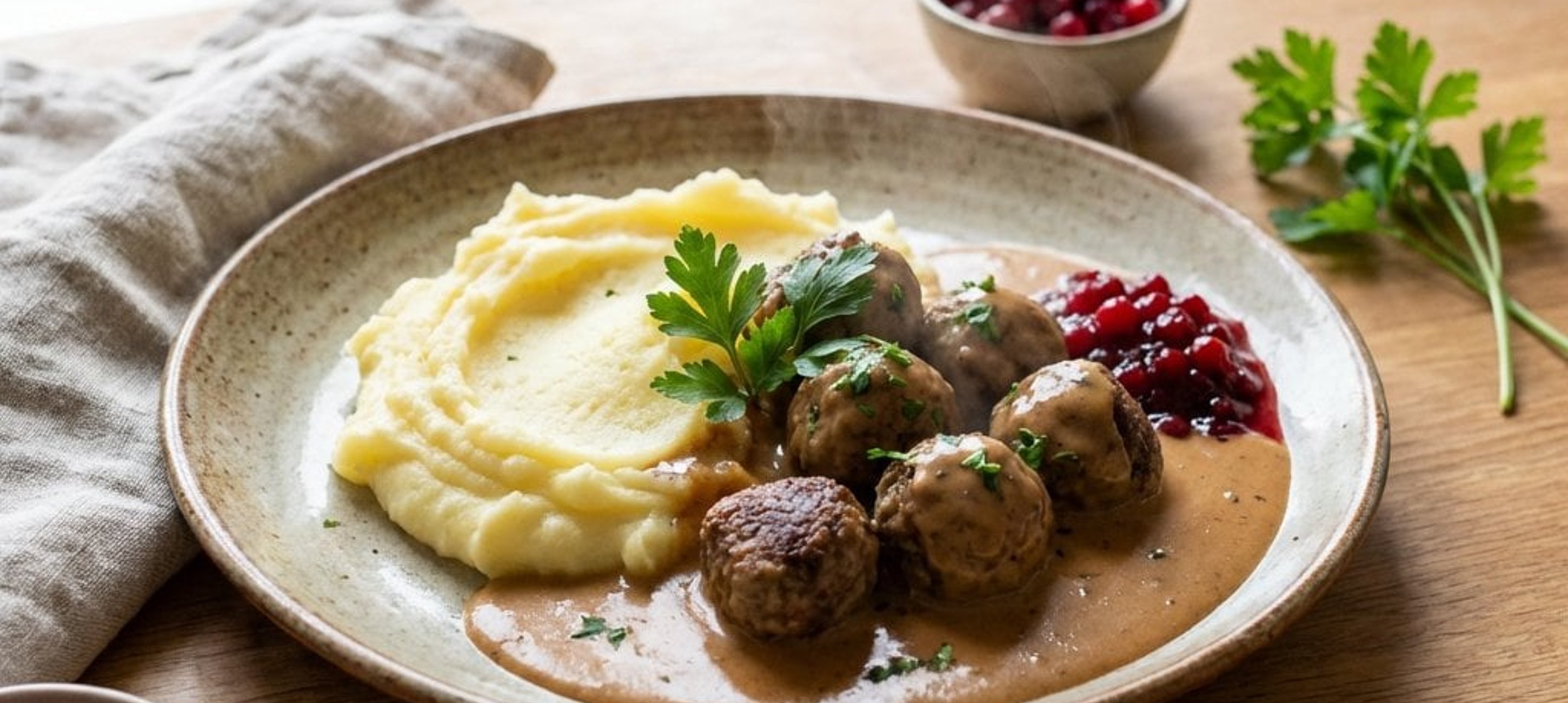 - 2Die Fleischbällchen zusammen mit dem Kartoffelpüree und der Rahmsauce auf Tellern anrichten. Jede Portion mit getrockneten Cranberries bestreuen und nach Belieben mit frisch gehackter Petersilie garnieren. Warm servieren.