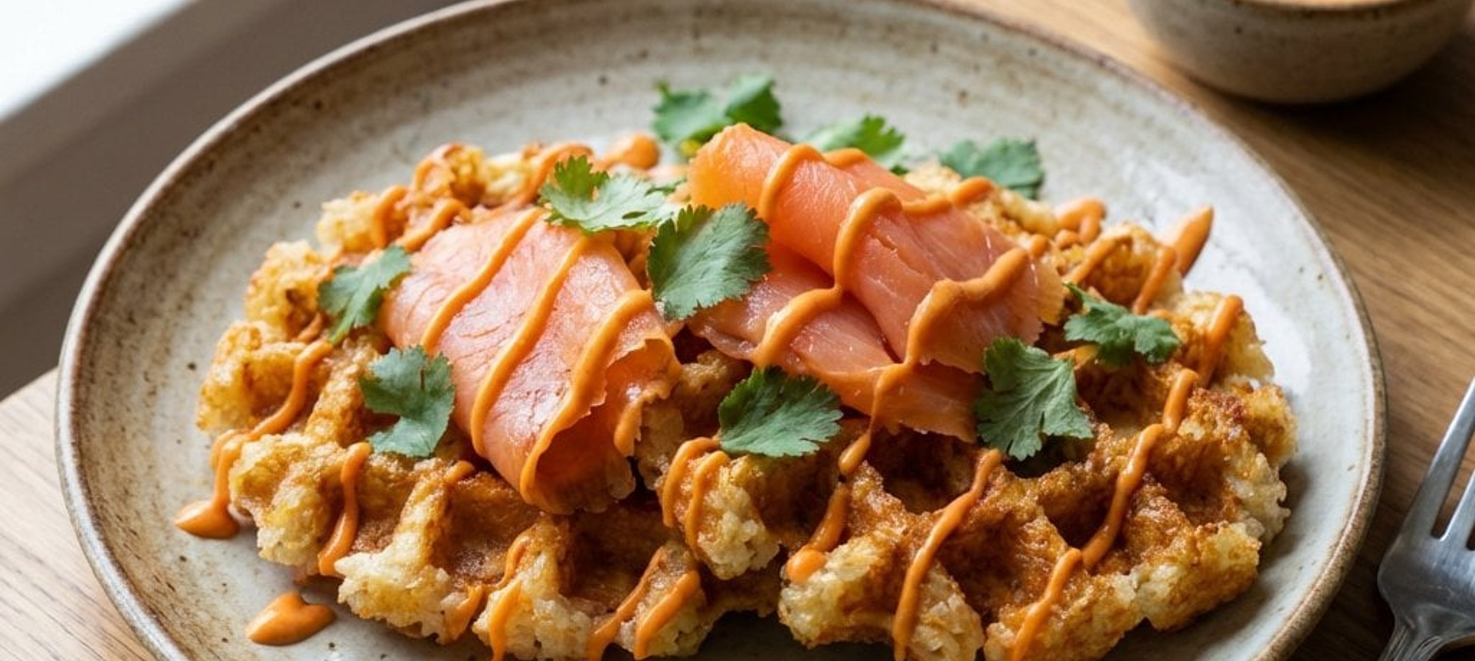 - 1Während die Waffeln backen, den Räucherlachs in feine Stücke schneiden. Den Koriander hacken.