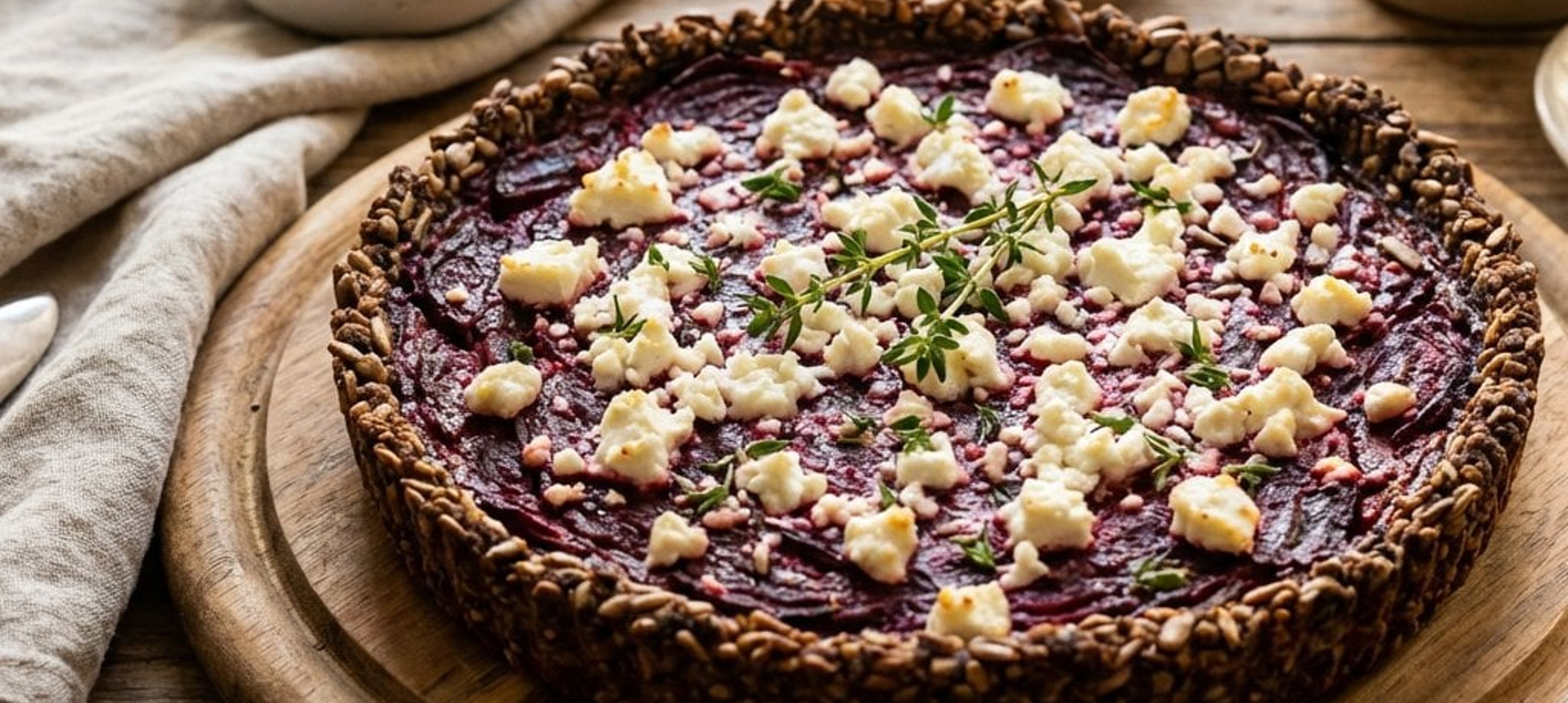 - 1Die gekochte Rote Bete grob raspeln. Mit Sauerrahm und 100 g des zerbröselten Balkankäses vermischen. Die Masse gleichmäßig auf dem vorgebackenen Boden verteilen. Den restlichen Käse (50 g) darüber streuen.