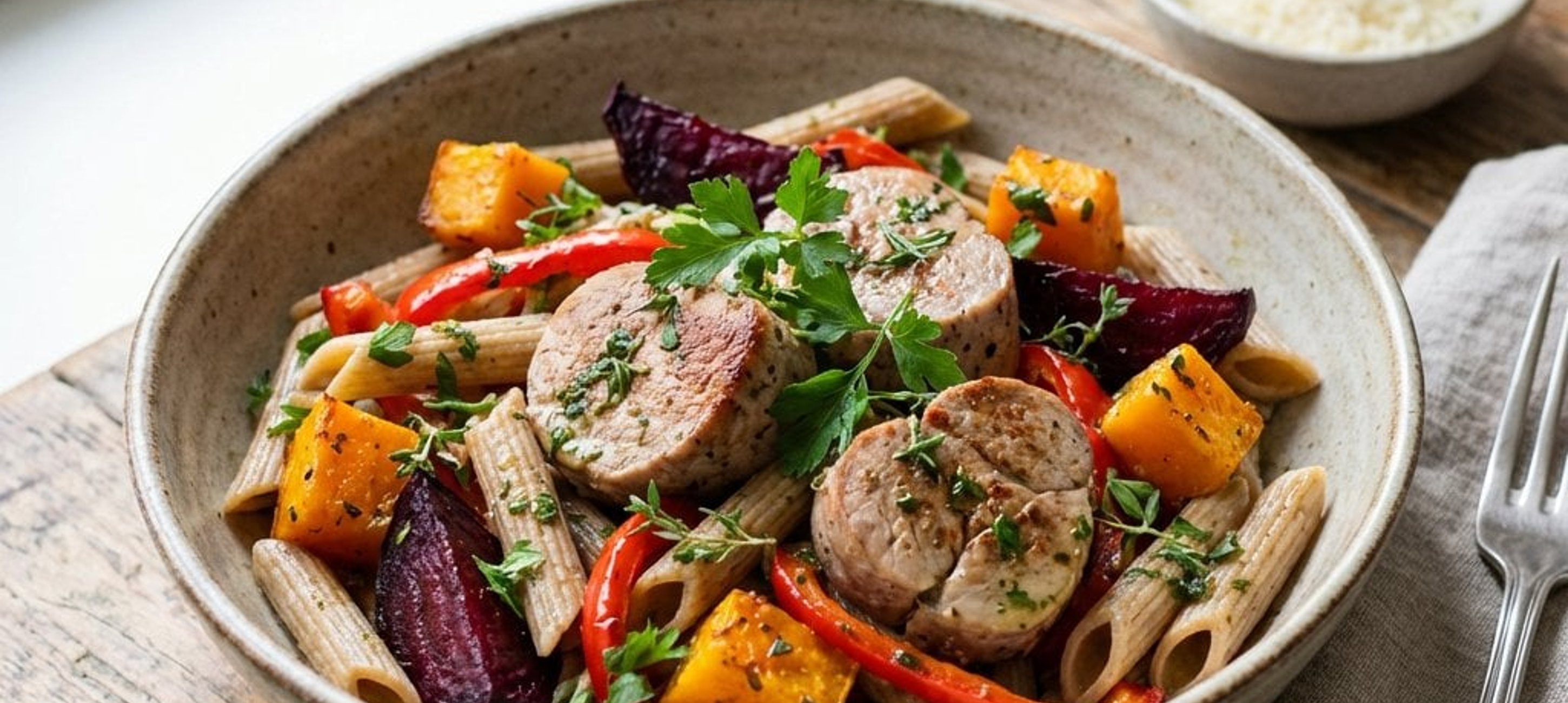 Ein gesundes Mittagessen, das lange satt macht. Das Röstgemüse bringt eine natürliche Süße mit, die hervorragend zum zarten Schweinefilet passt. Probiere auch anderes Saisongemüse wie Pastinaken oder Karotten!