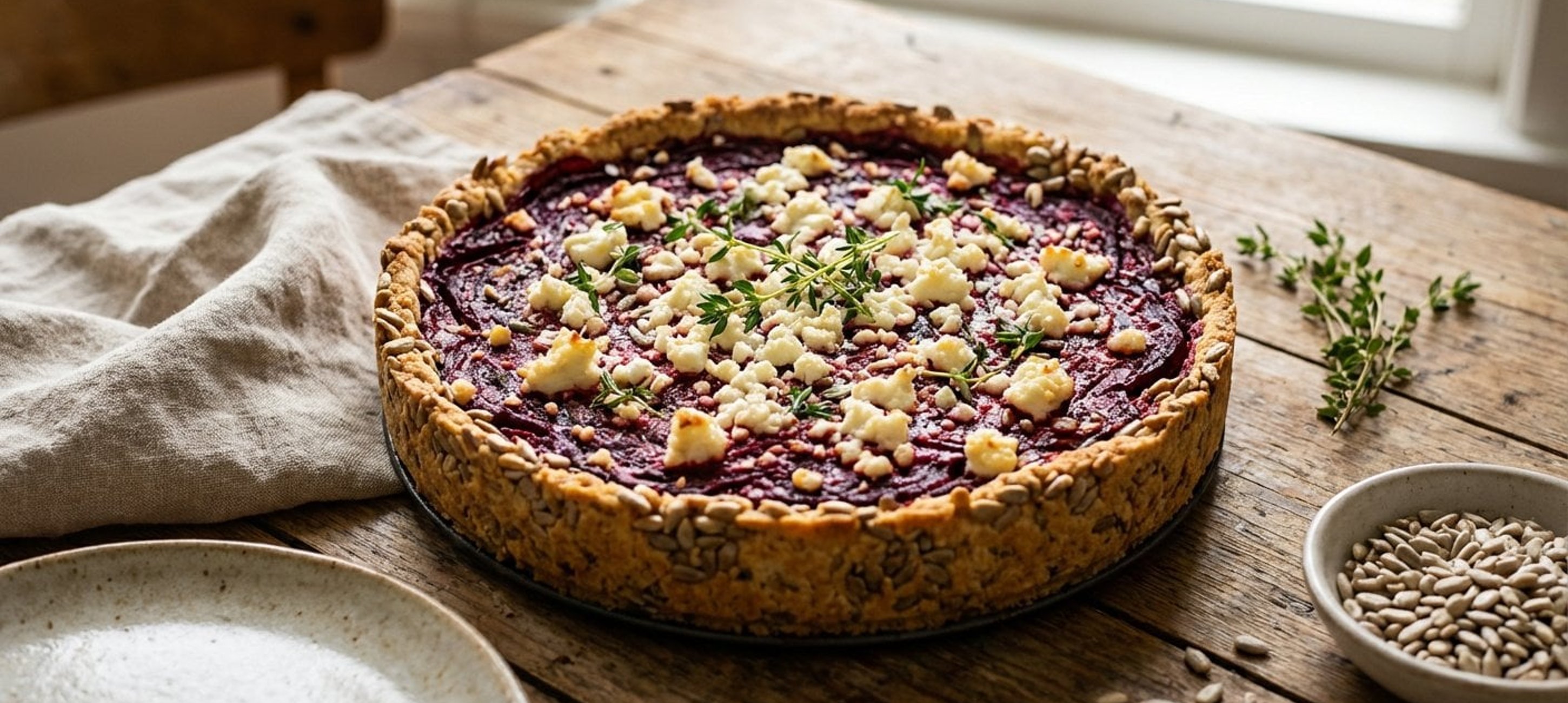 - 1Die gekochte Rote Bete grob raspeln. Mit Sauerrahm, einer Prise Salz und 100 g zerbröseltem Balkankäse vermischen. Die Mischung auf den vorgebackenen Boden geben und glatt streichen. Den restlichen Käse (50 g) darüber streuen.