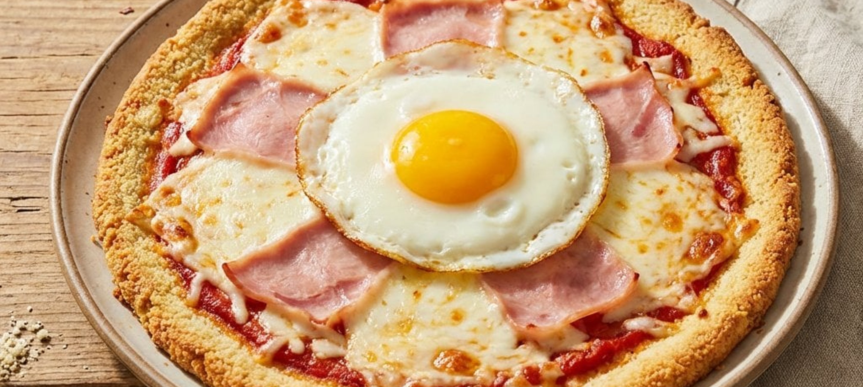 - 3In der Zwischenzeit das Tomatenmark mit Wasser, Oregano, dem restlichen Basilikum, Salz und Pfeffer glatt rühren. Die Sauce auf den vorgebackenen Boden streichen, mit Schinkenscheiben belegen und das letzte Ei in die Mitte aufschlagen. Die Pizza für weitere 15 Minuten fertig backen.