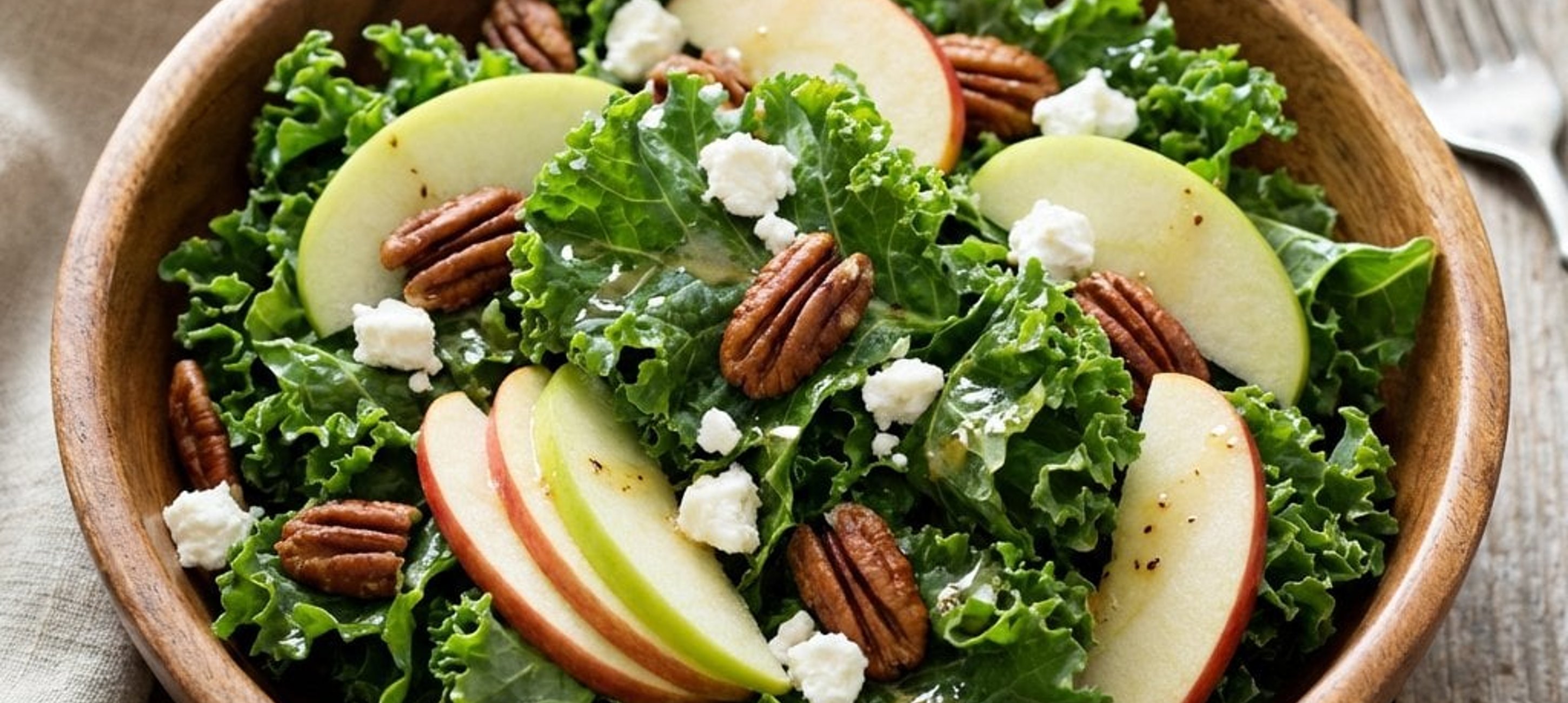 - 5Die Apfelstücke, den Ziegenkäse und die gerösteten Pekannüsse zum Grünkohl geben. Das Dressing darübergießen und alles vorsichtig vermengen. Sofort servieren.