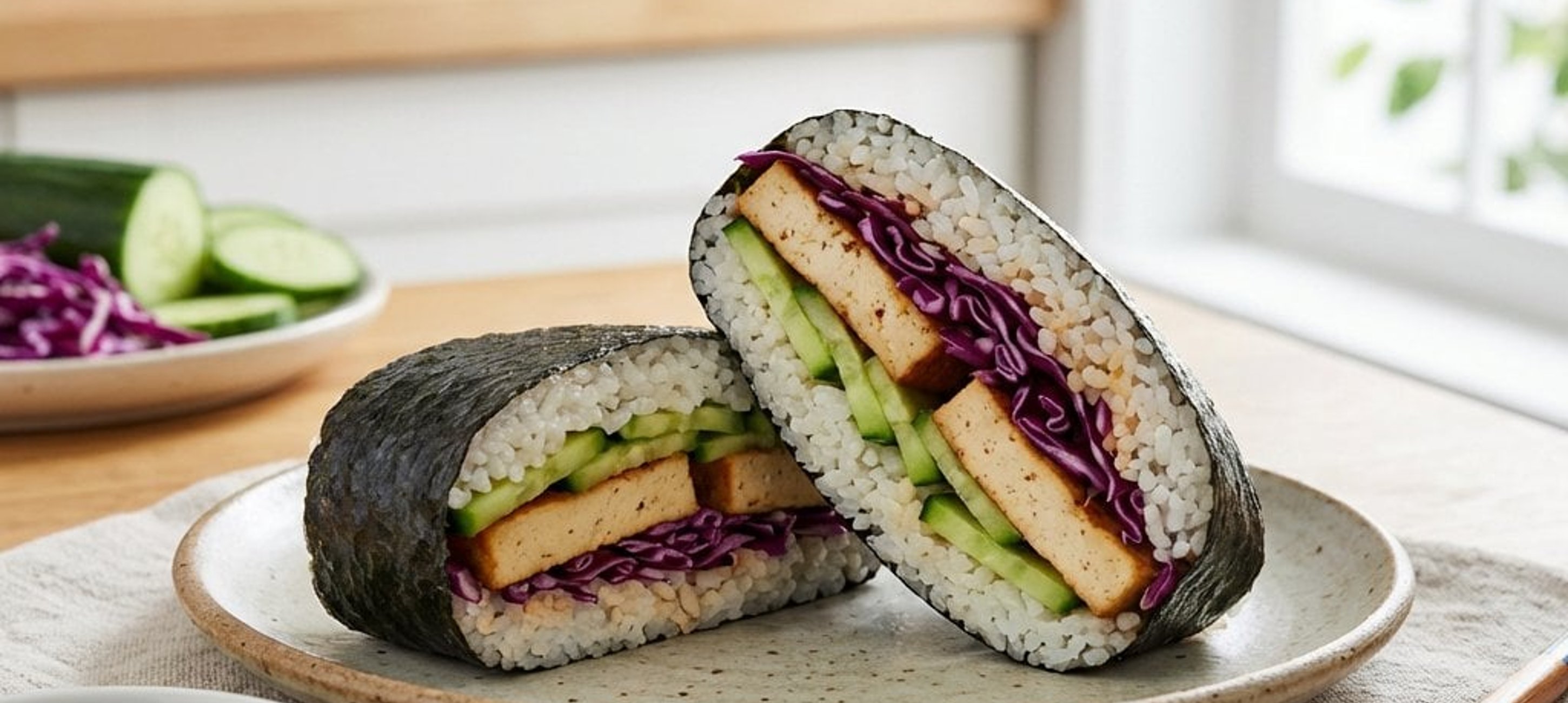 - 1Ein Stück Frischhaltefolie auf die Arbeitsfläche legen und ein Nori-Blatt mit der glänzenden Seite nach unten darauf platzieren. Eine kleine Portion Reis in die Mitte des Blattes geben und quadratisch flach drücken. Darauf die Gurkenscheiben, den marinierten Tofu und den Rotkohl schichten. Eine Sauce aus veganer Mayonnaise, Sriracha und einem Tropfen Sesamöl anrühren und über die Füllung geben. Zum Abschluss eine weitere schicht Reis darauf verteilen.