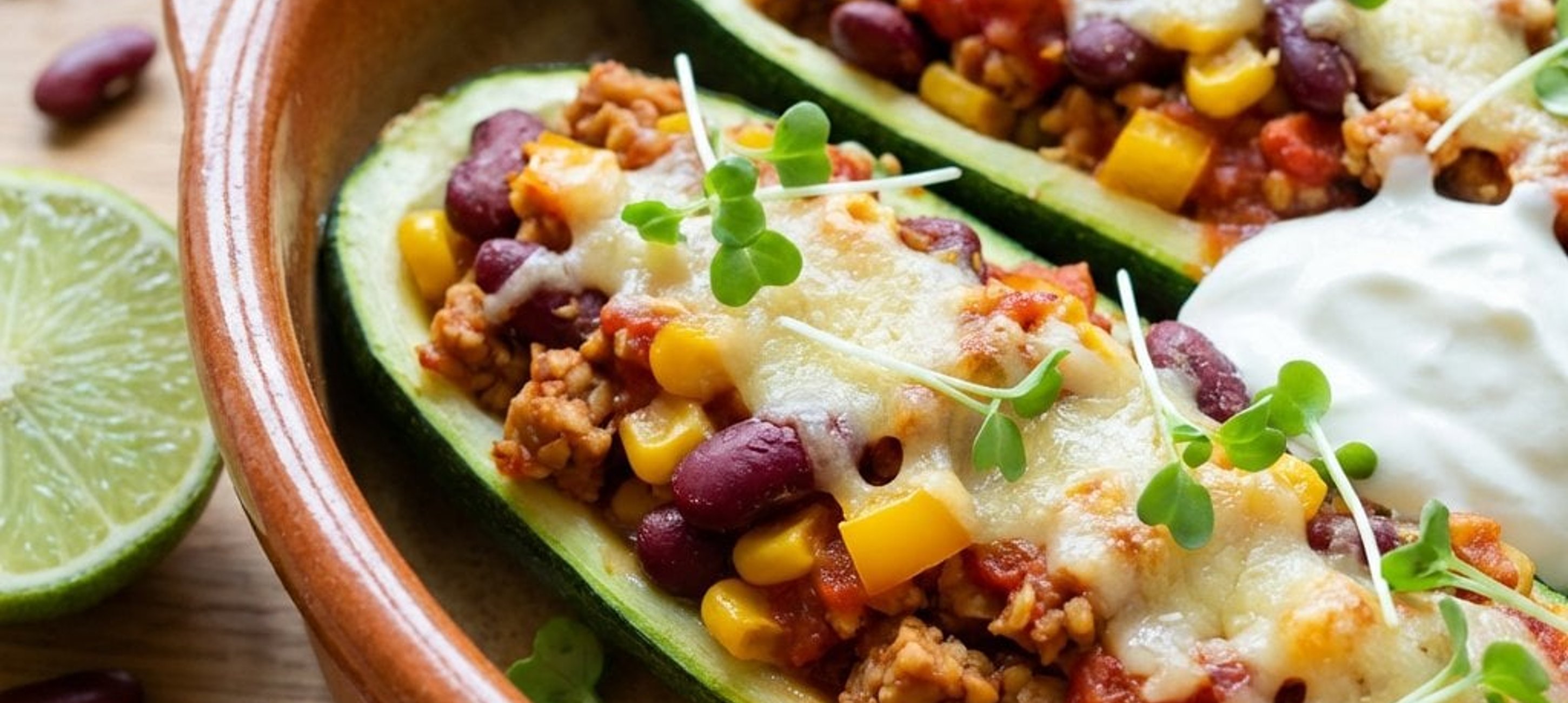 - 4Die überbackenen Zucchini mit frischer Kresse, Limettenspalten und einem Klecks saurer Sahne servieren.