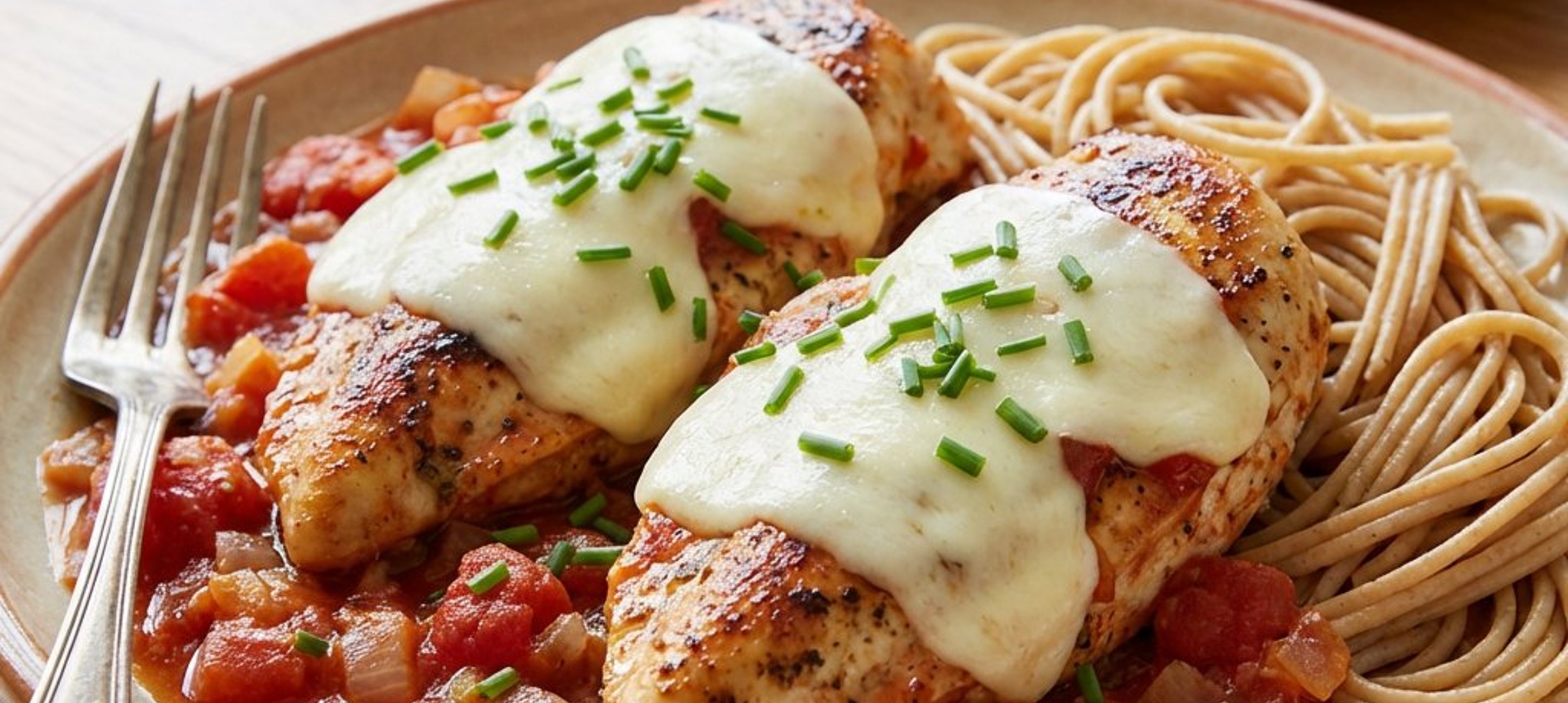 - 3Die angebratenen Hähnchenbrustfilets zurück in die Pfanne legen, mit der Tomatensauce bedecken und den Mozzarella darauf verteilen. Die Pfanne mit einem Deckel abdecken und bei mittlerer Hitze ca. 3–4 Minuten schmelzen lassen, bis das Hähnchen gar ist. Mit den Vollkornnudeln servieren.