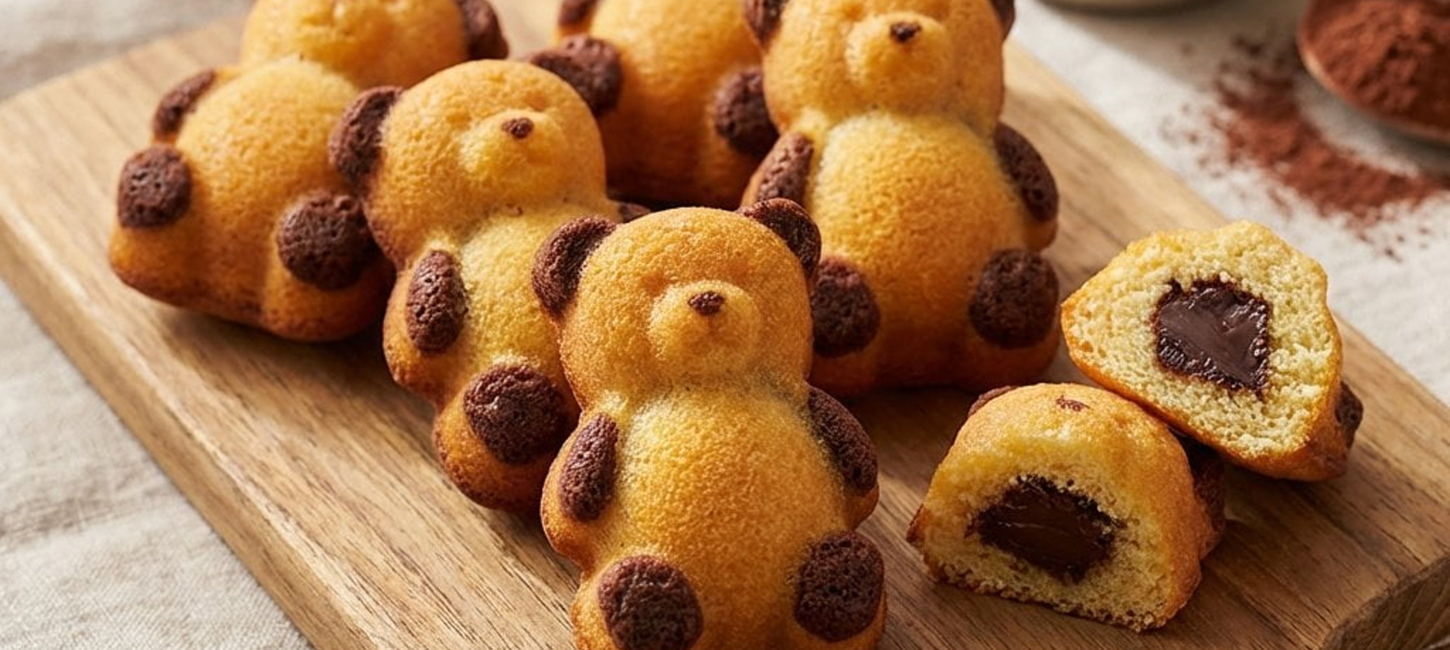 - 4Die abgekühlten Bärenkuchen mithilfe eines Spritzbeutels mit der Kakaocreme füllen. Die Bären können sofort serviert werden. Tip: Alternativ kann vor dem Backen ein Stück Schokolade in den Teig gedrückt werden.