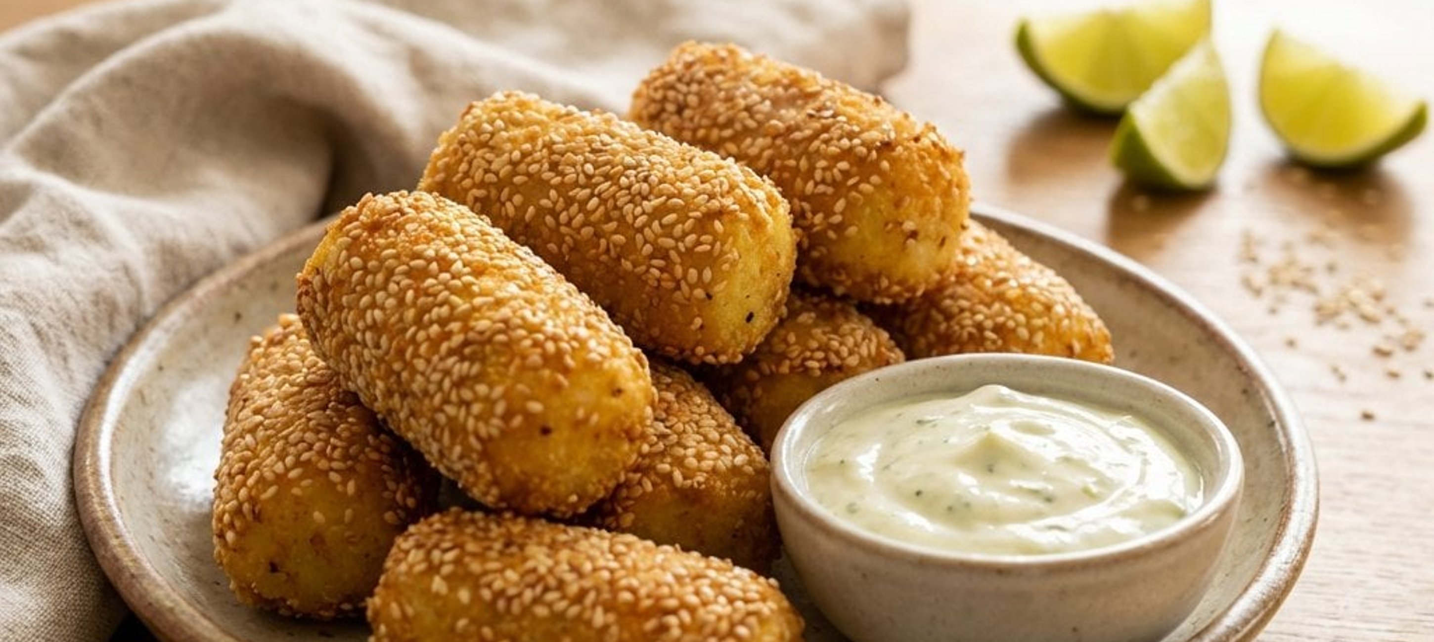 - 1Für den Dip die Saure Sahne mit dem Limettensaft und der restlichen Prise Salz glatt rühren. Die warmen Kroketten zusammen mit dem Dip servieren.