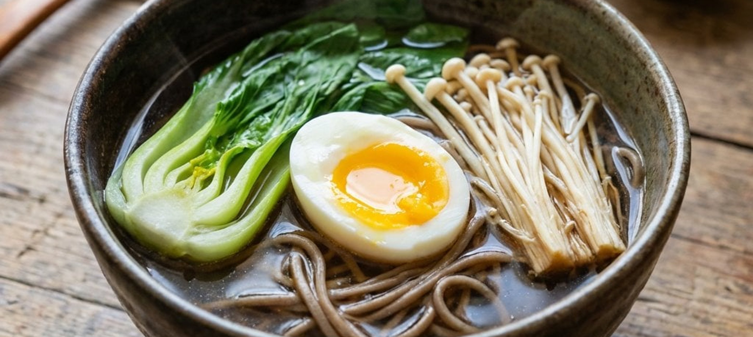 - 5Die Nudeln und den Pak Choi auf zwei Schüsseln verteilen und mit der heißen Gemüsebrühe aufgießen. Die Eier pellen, halbieren und zusammen mit den Enoki-Pilzen auf der Suppe anrichten. Nach Belieben mit frischen Kräutern oder Chiliflocken garnieren.