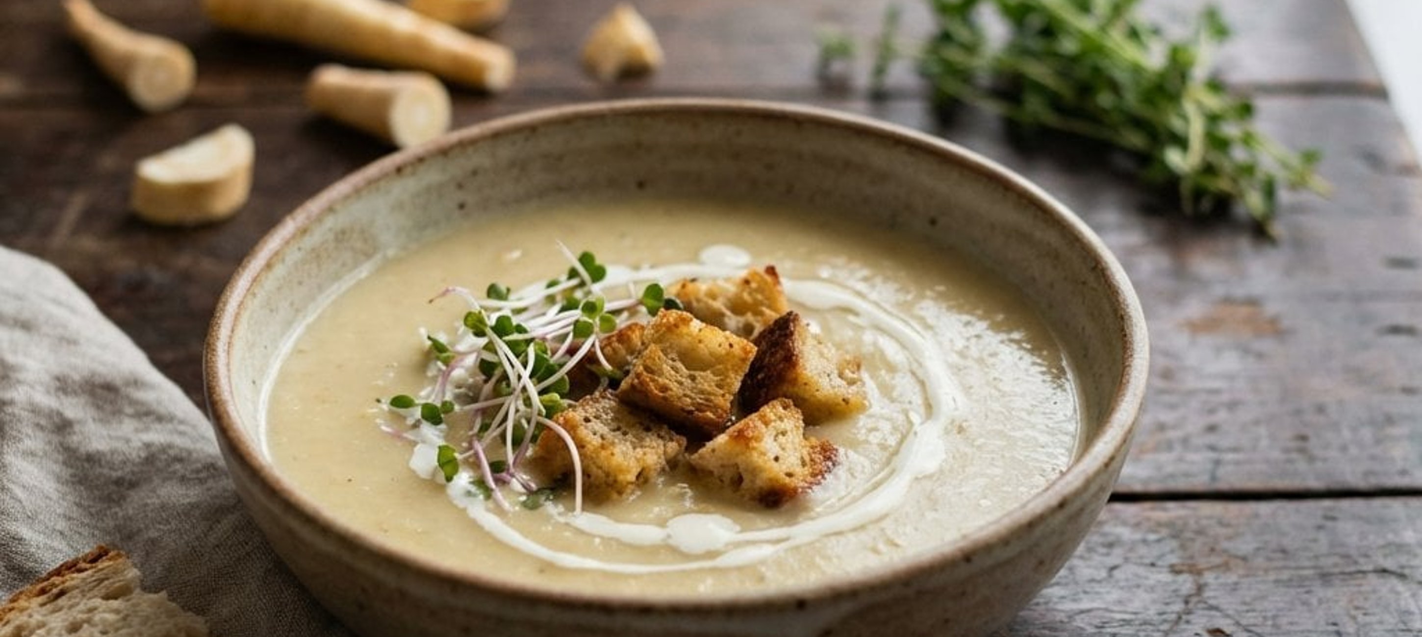 Ein Spritzer frischer Zitronensaft kurz vor dem Servieren hebt die erdigen Noten der Pastinake hervor und sorgt für eine wunderbare Frische. Dazu passt ein kräftiges Bauernbrot.