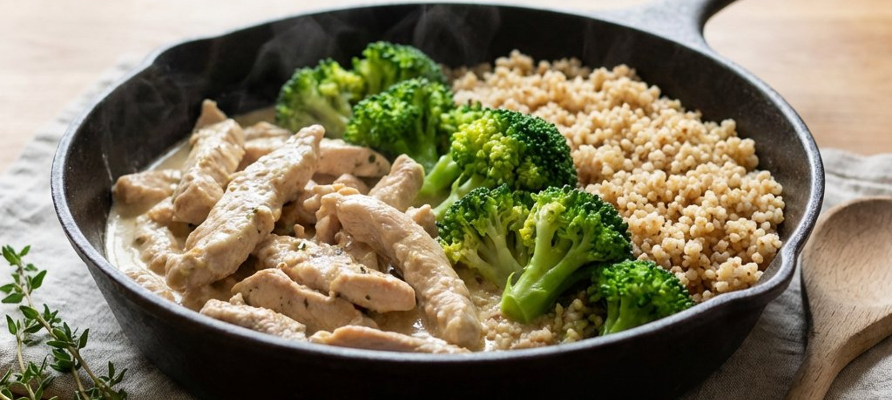 - 5Alles mit der Sojasahne aufgießen, den gekochten Brokkoli hinzufügen und die gesamte Mischung nochmals ca. 3 Minuten erwärmen. Die fertige Putenpfanne zusammen mit dem Couscous servieren.