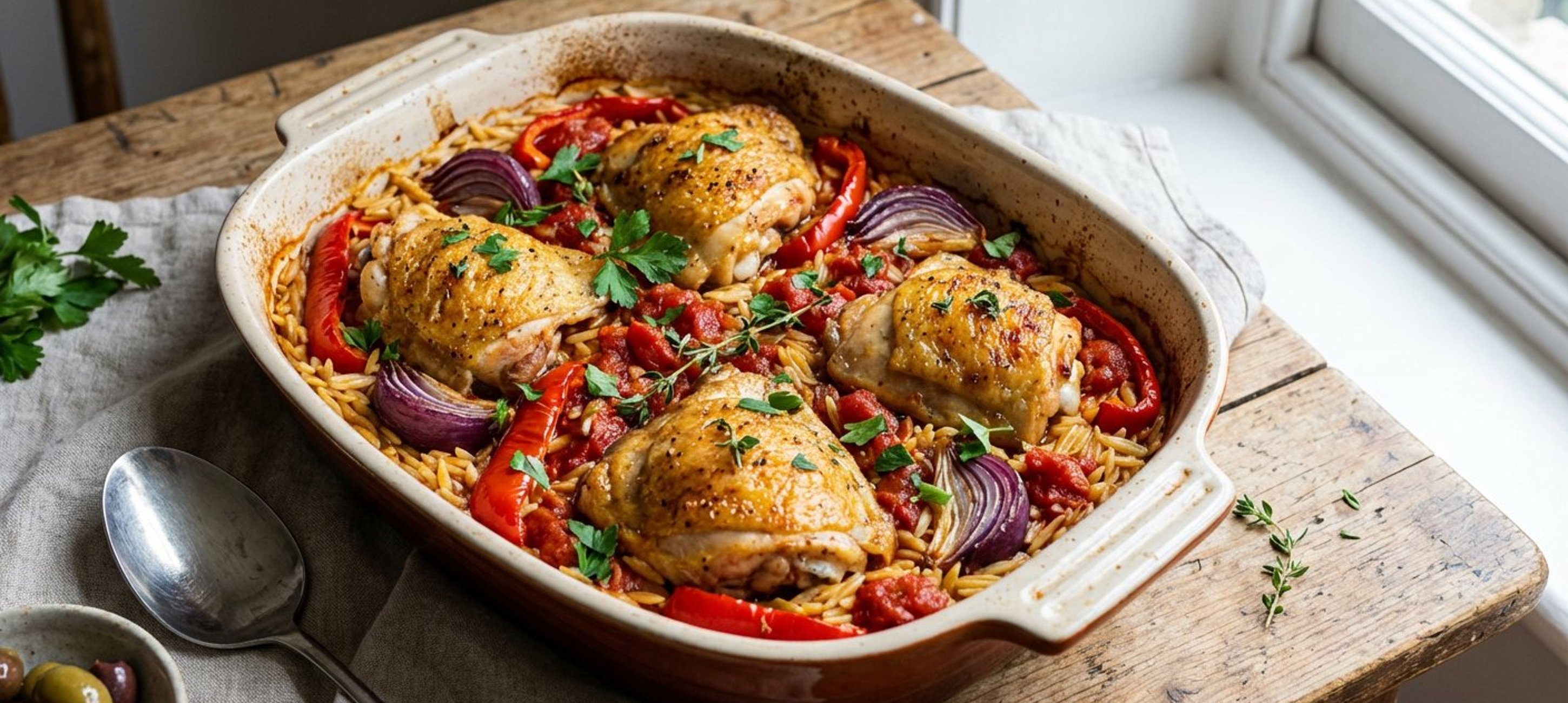 - 1Die Sauce mit Salz und Pfeffer abschmecken. Die Orzo-Pasta unterrühren und die Pfanne vom Herd nehmen. Die gesamte Mischung in eine große Auflaufform geben. Die angebratenen Hähnchenteile obenauf legen.