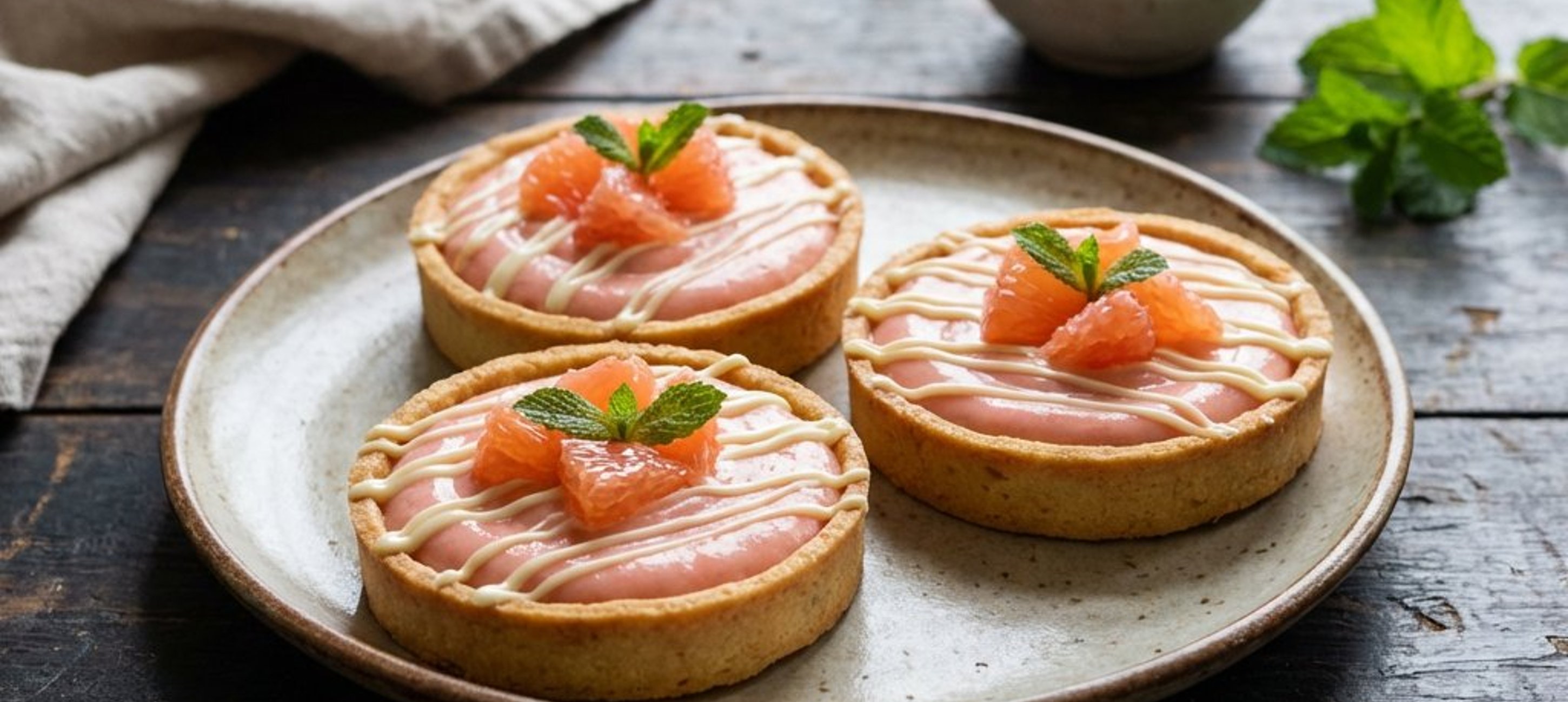 - 1Zuerst die Grapefruit-Creme auf den Boden der Tartelettes streichen. Dann die Grapefruit-Ganache bis zum Rand der Tartelettes eingießen.