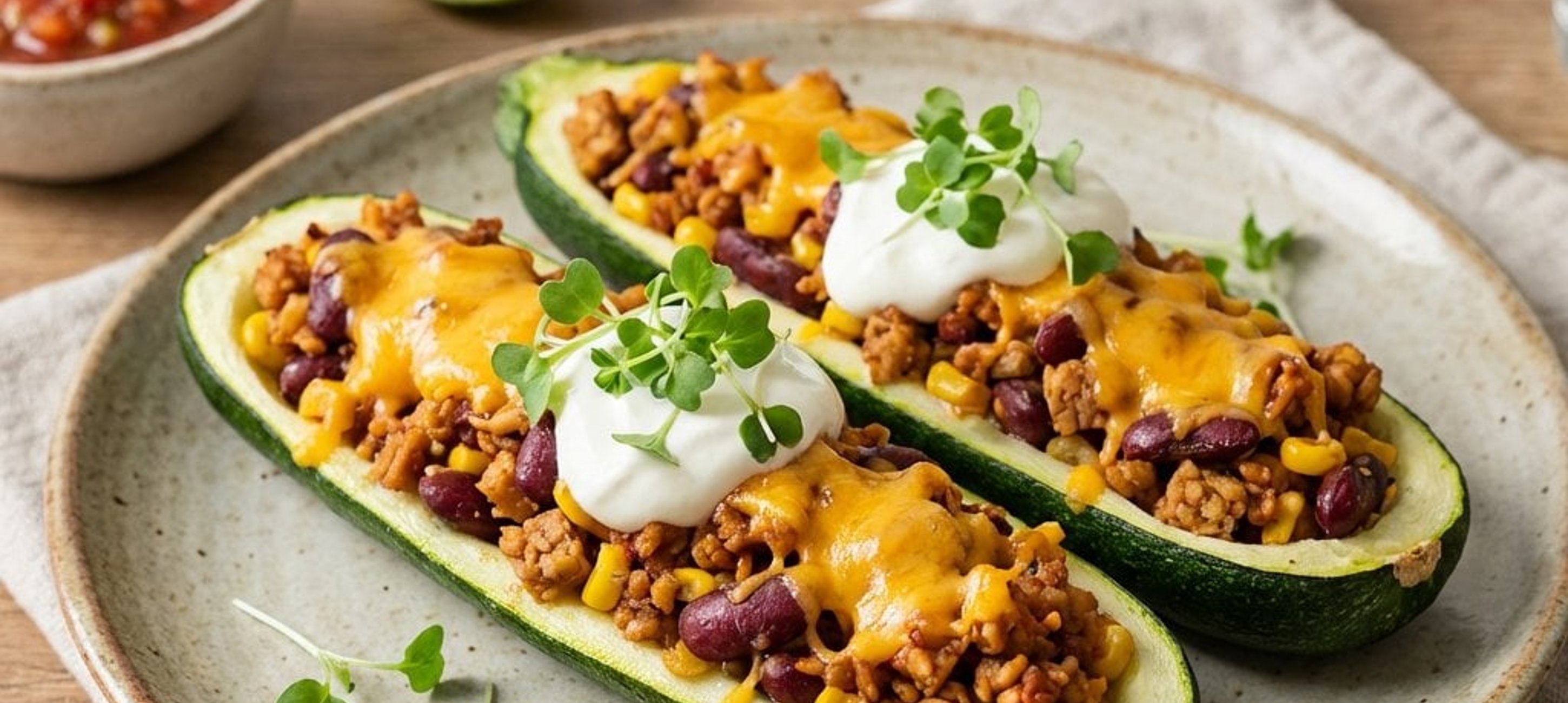 - 1Die gebackenen Zucchini heiß servieren. Mit einem Klecks saurer Sahne, frischen Microgreens und einer Limettenspalte garnieren. Guten Appetit!