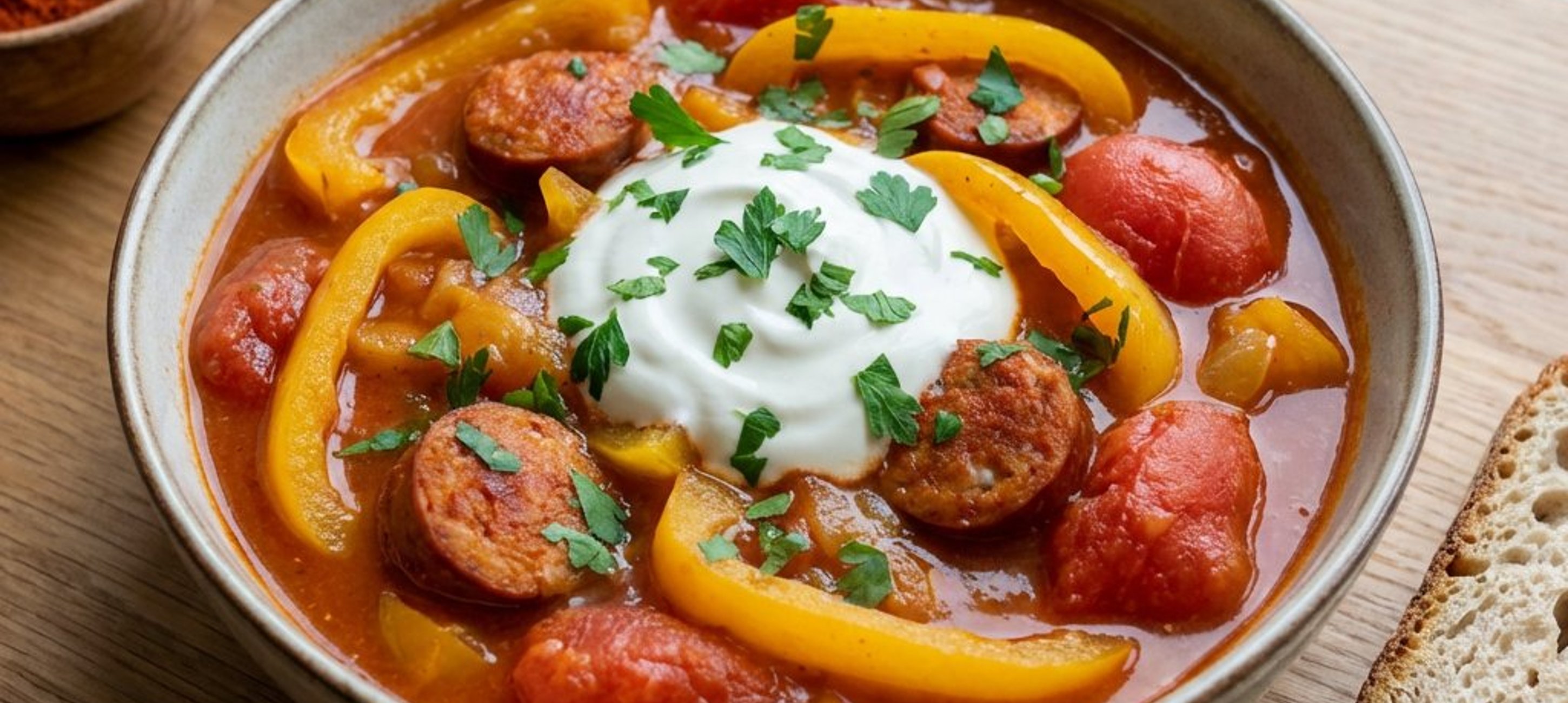 - 4Das Letscho heiß servieren, mit einem Klecks Sauerrahm garnieren und mit frischem Baguette genießen.