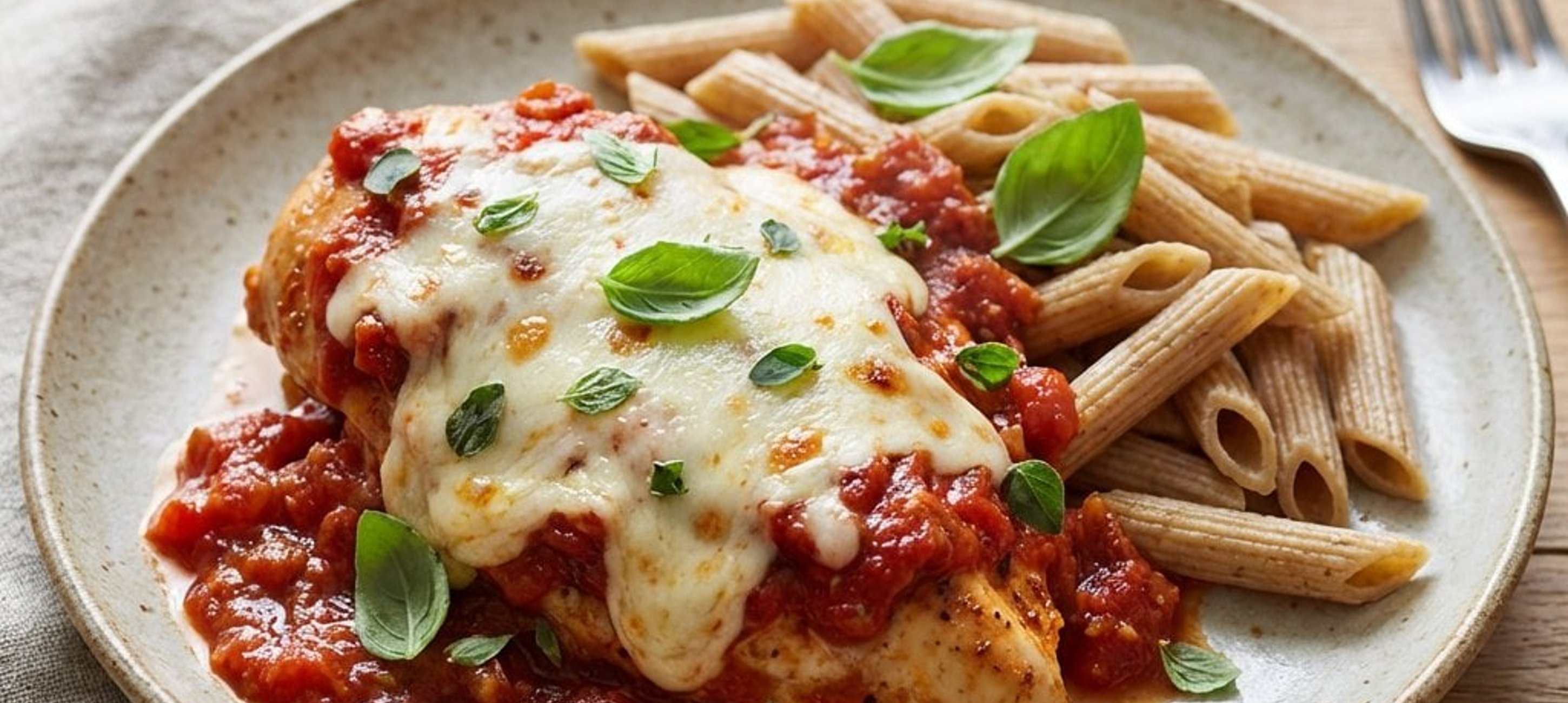 - 3Die angebratenen Hähnchenbrustfilets zurück in die Pfanne in die Sauce legen. Jedes Filet mit Mozzarella-Scheiben belegen. Die Pfanne mit einem Deckel abdecken und bei mittlerer Hitze ca. 3–4 Minuten ziehen lassen, bis der Käse geschmolzen und das Fleisch gar ist. Die Hähnchenbrust zusammen mit der Tomatensauce auf der gekochten Pasta anrichten und servieren.