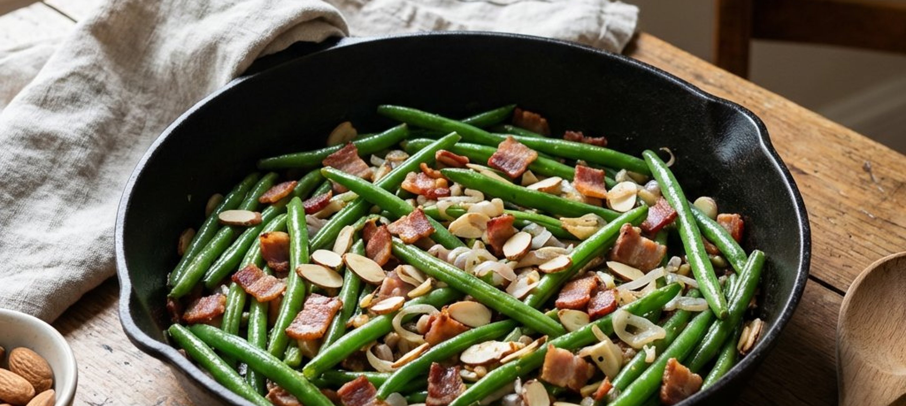 - 4In der Zwischenzeit die Mandelblättchen in einer fettfreien Pfanne goldbraun rösten. Sobald die Bohnen fertig sind, die Mandeln unterheben und sofort servieren.