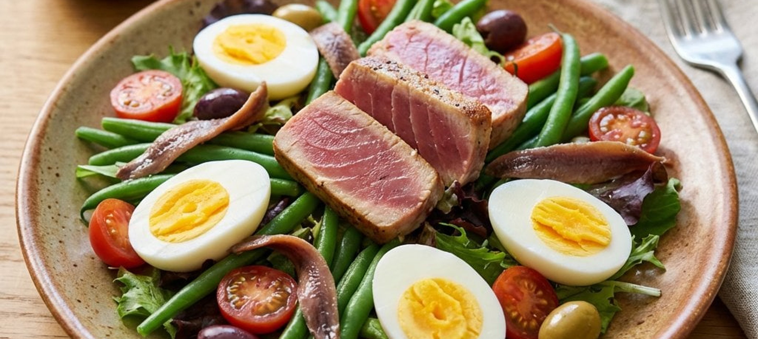 - 5Auf einer großen Platte oder in einer Schüssel zuerst den Salat anrichten. Darauf die Kartoffeln, Bohnen, Tomaten, Oliven und Eier verteilen. Den Thunfisch darüber bröseln und die Sardellenfilets darauf anrichten.