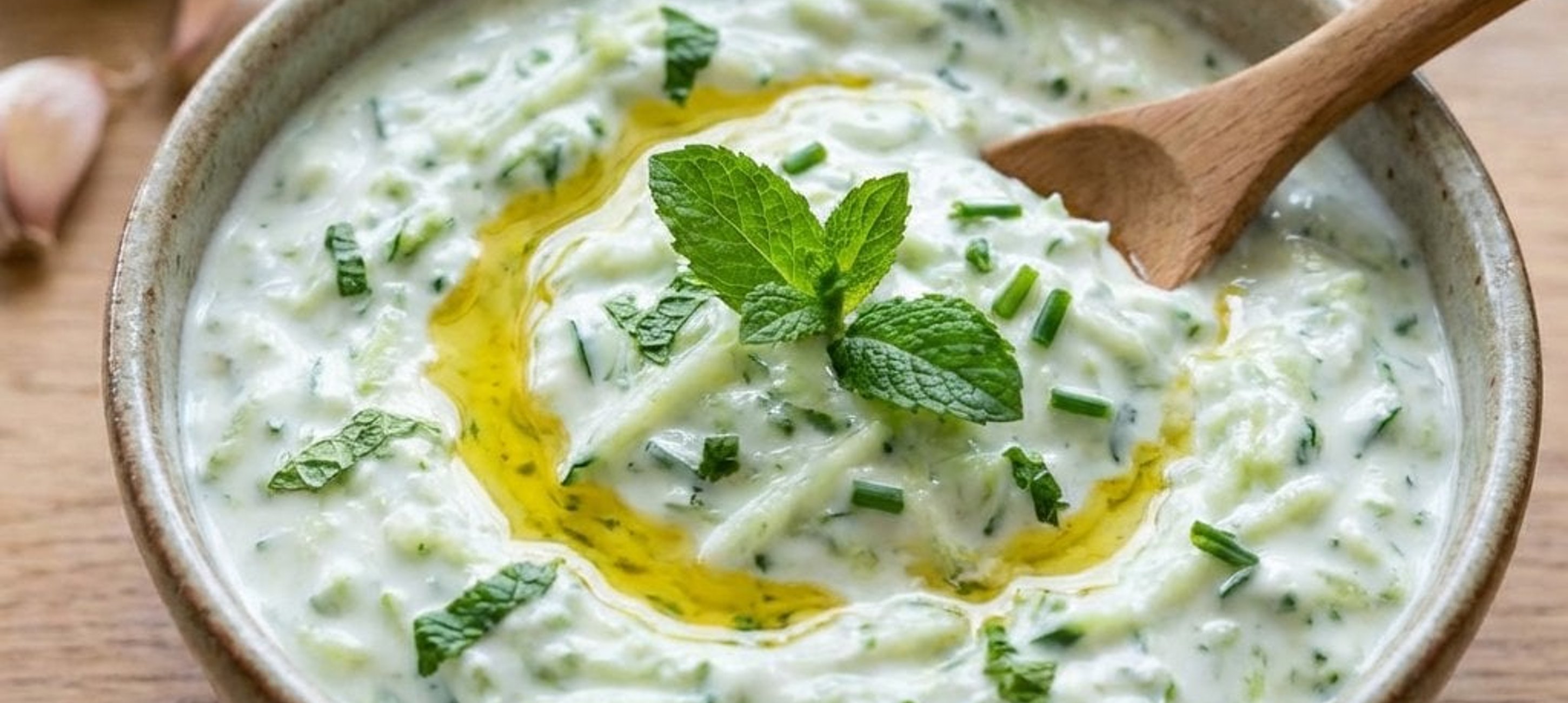 - 2In einer Schüssel den griechischen Joghurt mit Olivenöl, Zitronensaft und dem gepressten Knoblauch glatt rühren. Die Minze und den Schnittlauch fein gehackt und unter die Joghurtmasse heben. Mit Salz und Pfeffer abschmecken.