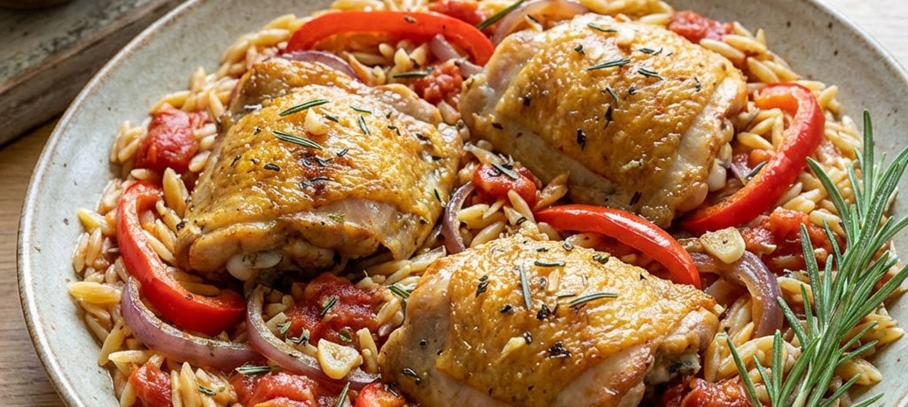 - 1Nach 10 Minuten die Sauce mit Salz und Pfeffer abschmecken. Die Orzo-Pasta unterrühren und die gesamte Mischung in die Auflaufform umfüllen. Die angebratenen Hähnchenschenkel obenauf legen. Im vorgeheizten Ofen bei 180 °C ca. 20 Minuten backen. Danach die Temperatur auf 220 °C erhöhen und weitere 10 Minuten knusprig fertig backen.