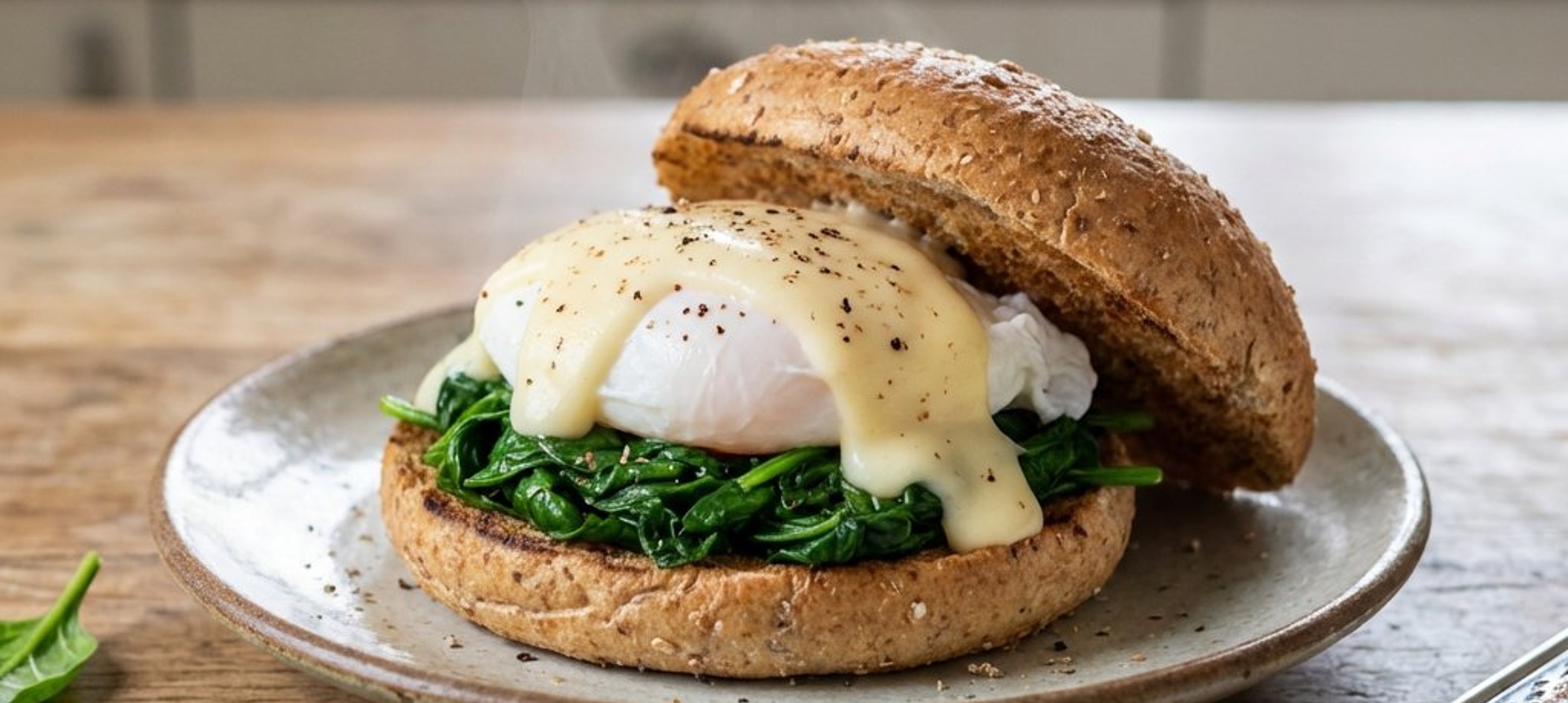 - 2Anrichten: Auf die unteren Brötchenhälften den gedünsteten Spinat verteilen. Je ein pochiertes Ei daraufsetzen, großzügig mit der Käsesauce übergießen und die obere Brötchenhälfte auflegen. Sofort servieren.