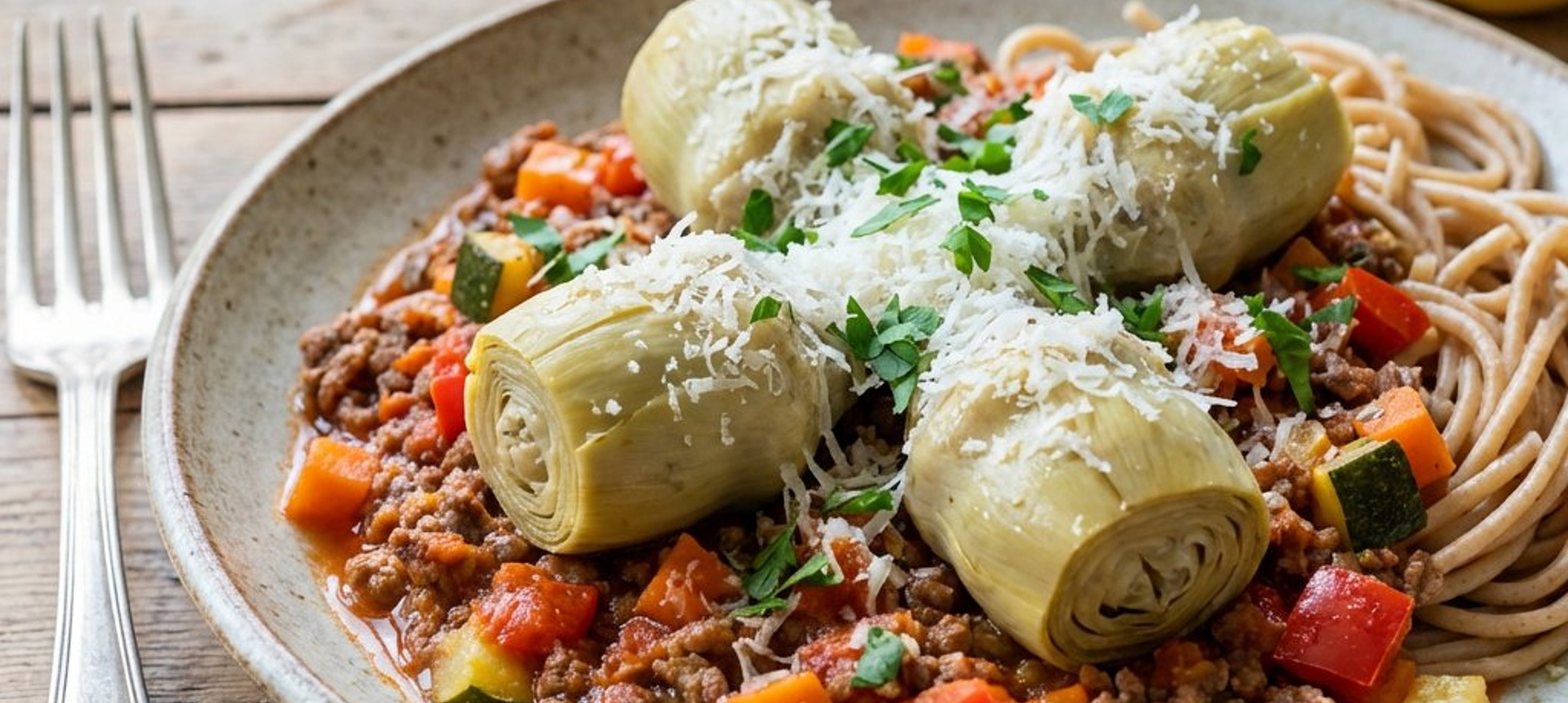 - 1Die fertige Sauce auf Tellern anrichten, die gekochten Artischocken darauf platzieren und mit einer Mischung aus geriebenem Grana Padano und gehackter Petersilie bestreuen. Zusammen mit den gekochten Vollkornnudeln servieren.