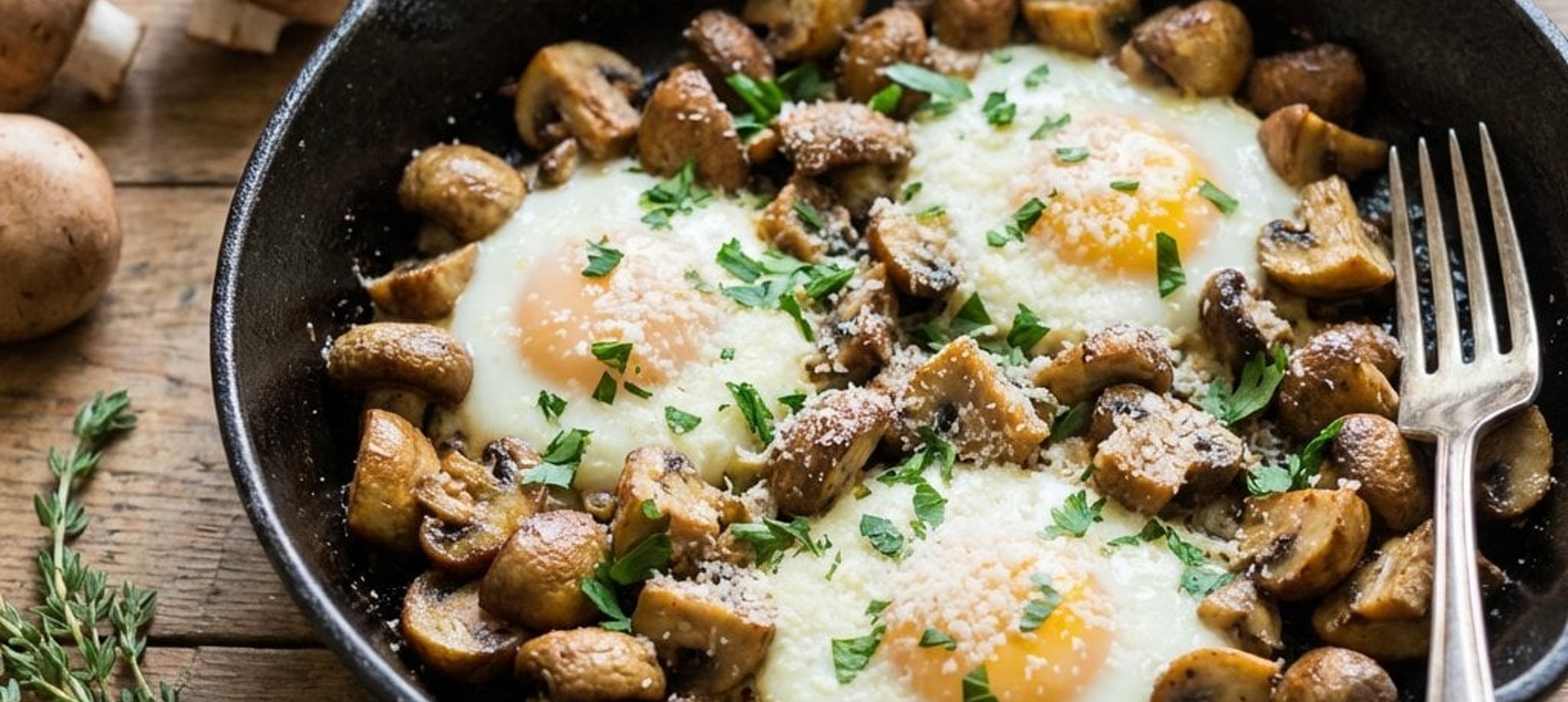 - 3Schlagen Sie die Eier vorsichtig über den Pilzen in die Pfanne auf und bestreuen Sie alles gleichmäßig mit dem geriebenen Parmesan. Schieben Sie die Pfanne in den vorgeheizten Ofen und backen Sie das Gericht für 4–5 Minuten, bis die Eier die gewünschte Konsistenz haben. Sofort servieren.