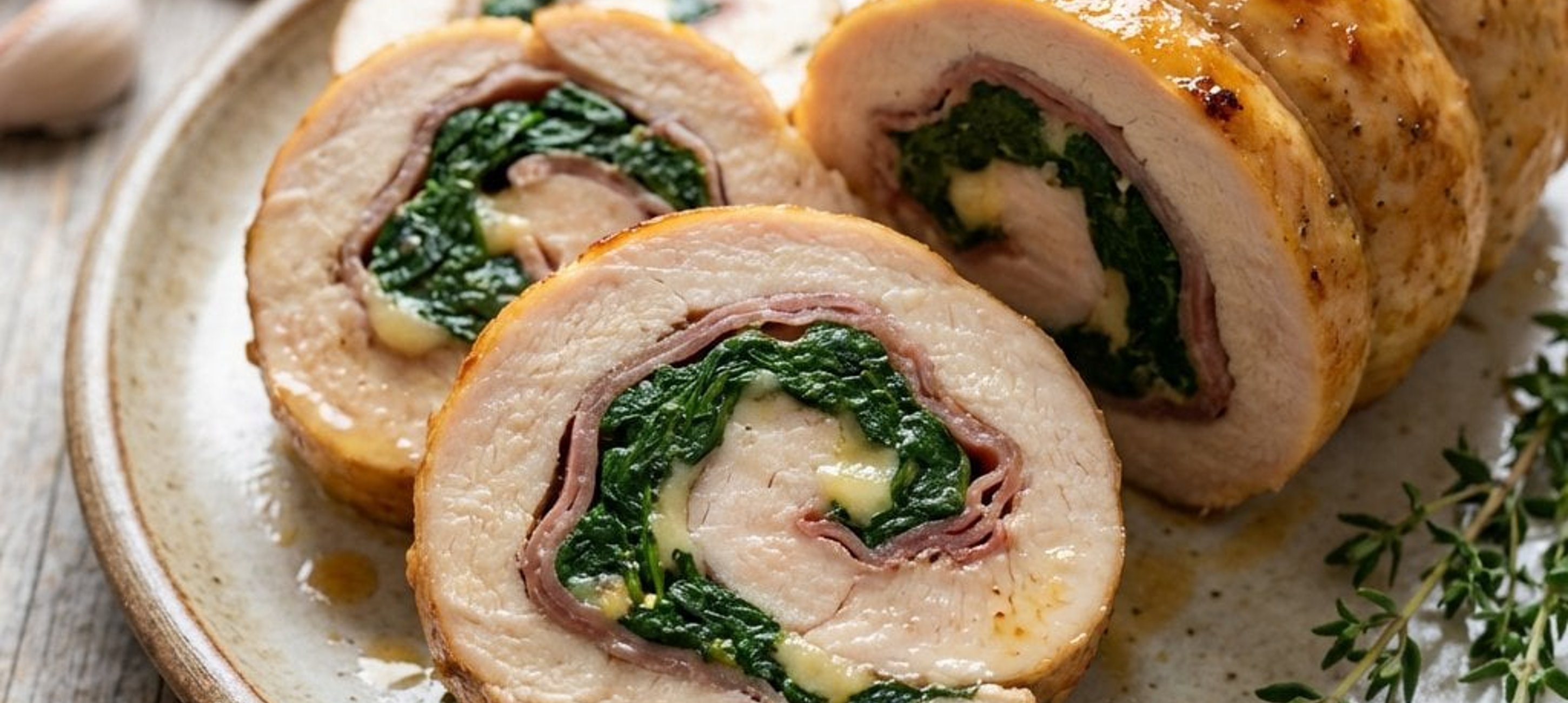 - 5Nach der Garzeit die Roulade vorsichtig aus der Folie nehmen. Die Ofentemperatur auf 220–225 °C erhöhen und die Roulade weitere 15–20 Minuten offen backen, bis sie eine schöne goldbraune Farbe hat. Kurz ruhen lassen, in Scheiben schneiden und servieren.