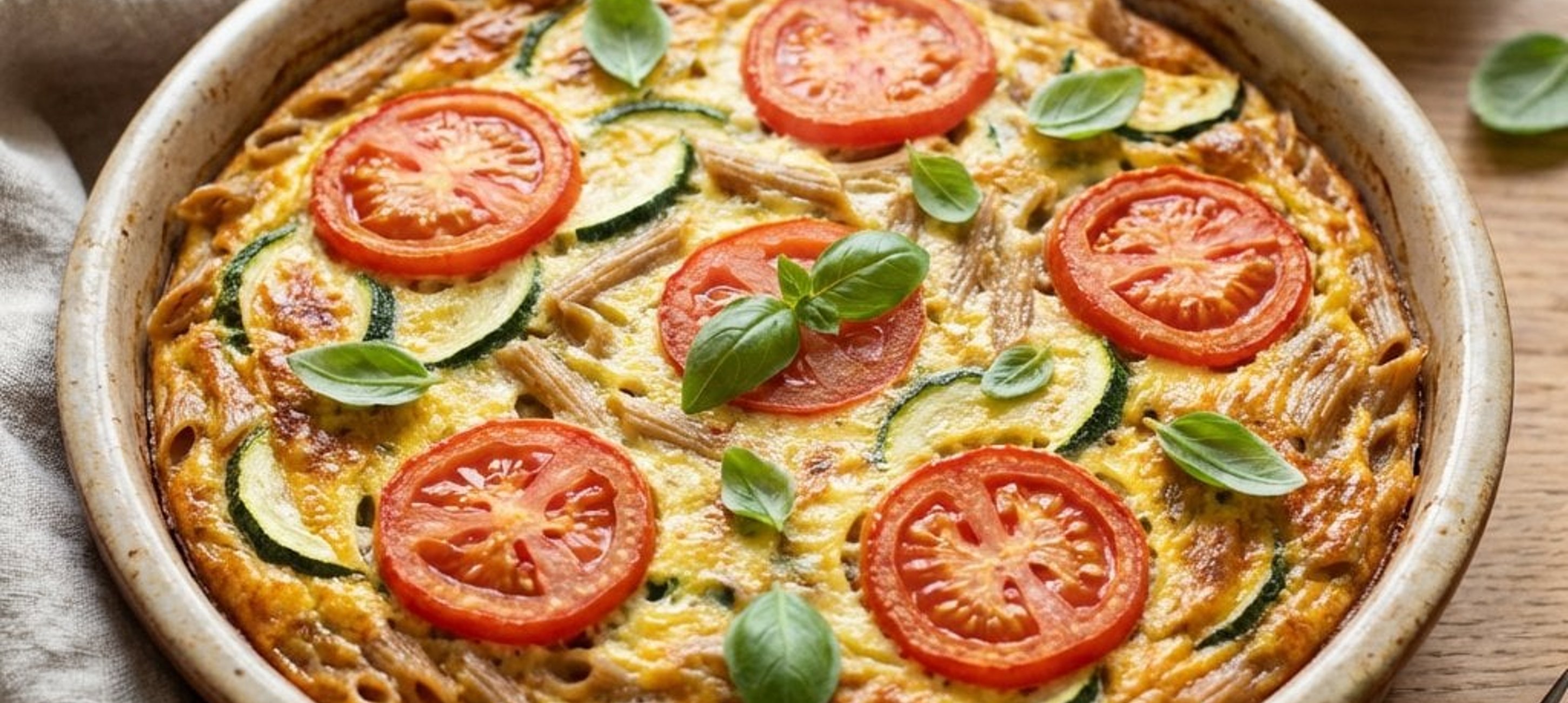 - 4Die gekochte Pasta abgießen, unter kaltem Wasser kurz abschrecken, gut abtropfen lassen und zur Ei-Gemüse-Mischung geben. Alles gut vermengen und in die vorbereitete Backform füllen. Die Tomaten in dicke Scheiben schneiden und auf der Frittata verteilen. Im Ofen bei 170–180 °C ca. 25–30 Minuten goldbraun backen.