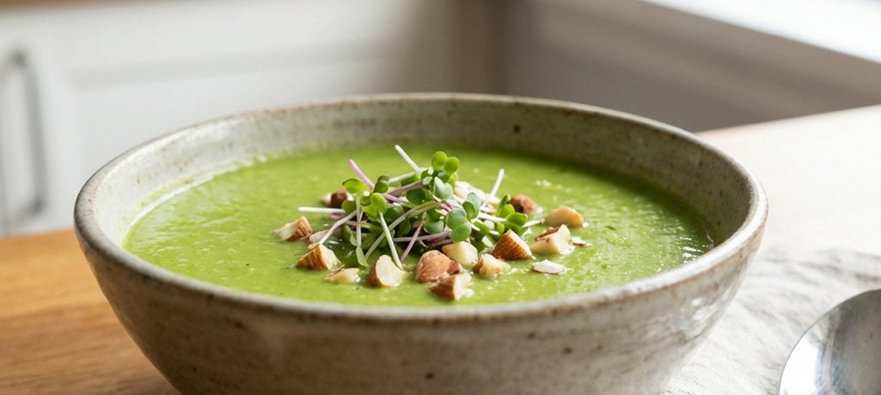 Ein Spritzer Zitronensaft kurz vor dem Servieren verleiht der Suppe eine zusätzliche Frische und hebt die grüne Farbe der Erbsen hervor.
