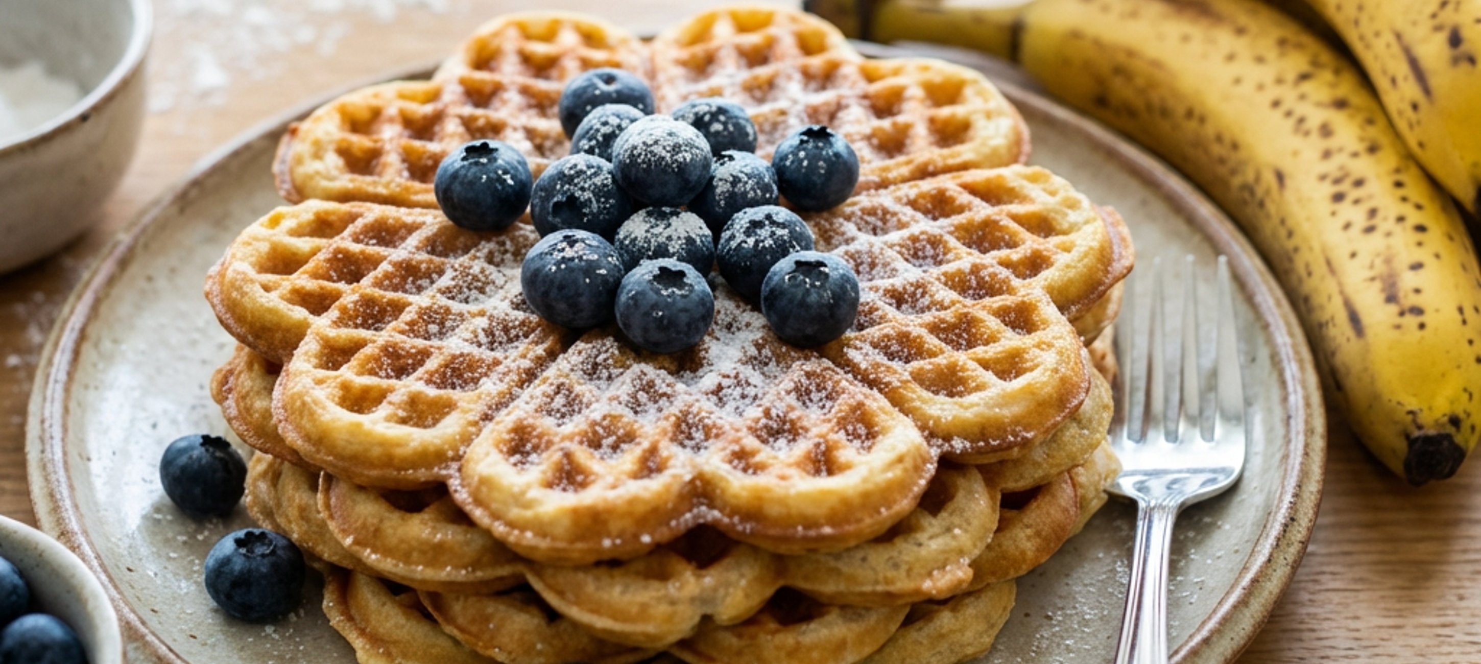 - 1Für den Waffelteig zwei reife Bananen schälen und mit einer Gabel fein zerdrücken. In eine Schüssel geben und mit 4 Eiern und 6 EL Mehl vermischen.