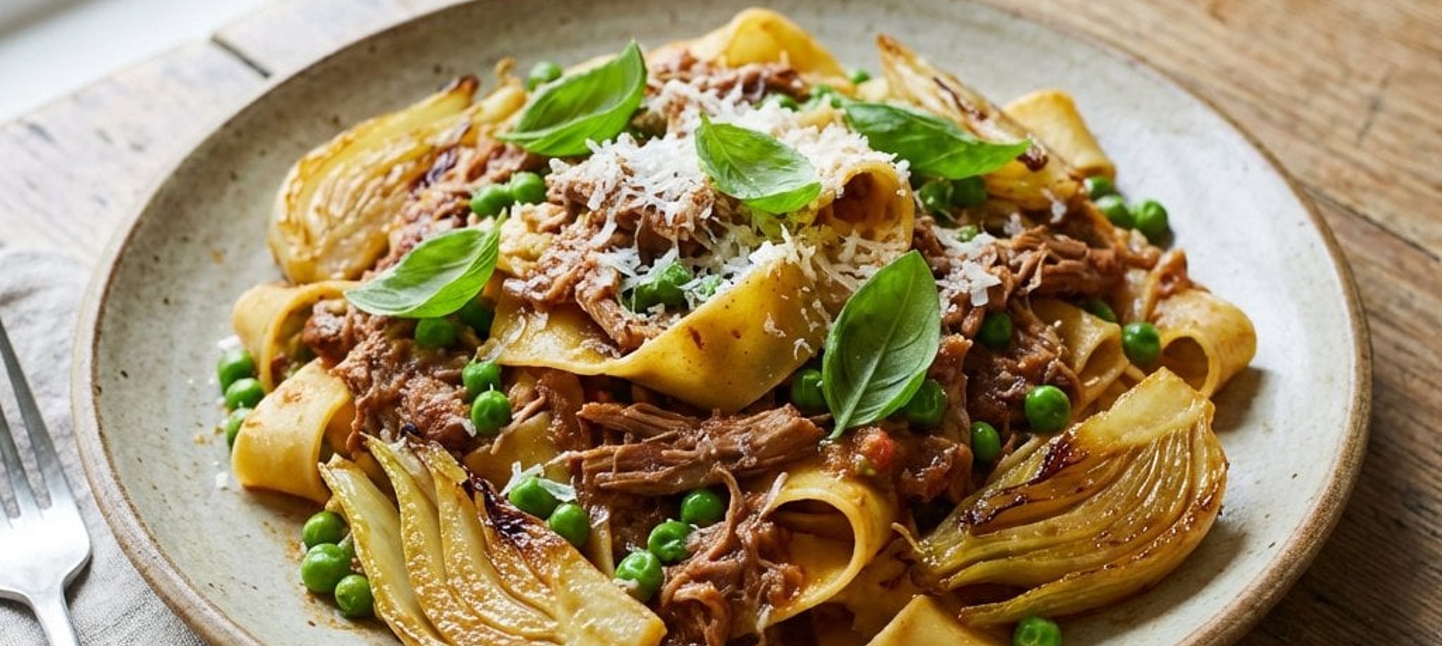 - 1Die Pappardelle nach Packungsanweisung in reichlich Salzwasser al dente kochen. Die heißen Nudeln direkt mit dem Kaninchenragout vermengen. Auf Tellern anrichten und mit dem karamellisierten Fenchel, den Erbsen und frischem Basilikum garnieren. Großzügig mit geriebenem Parmesan bestreuen.
