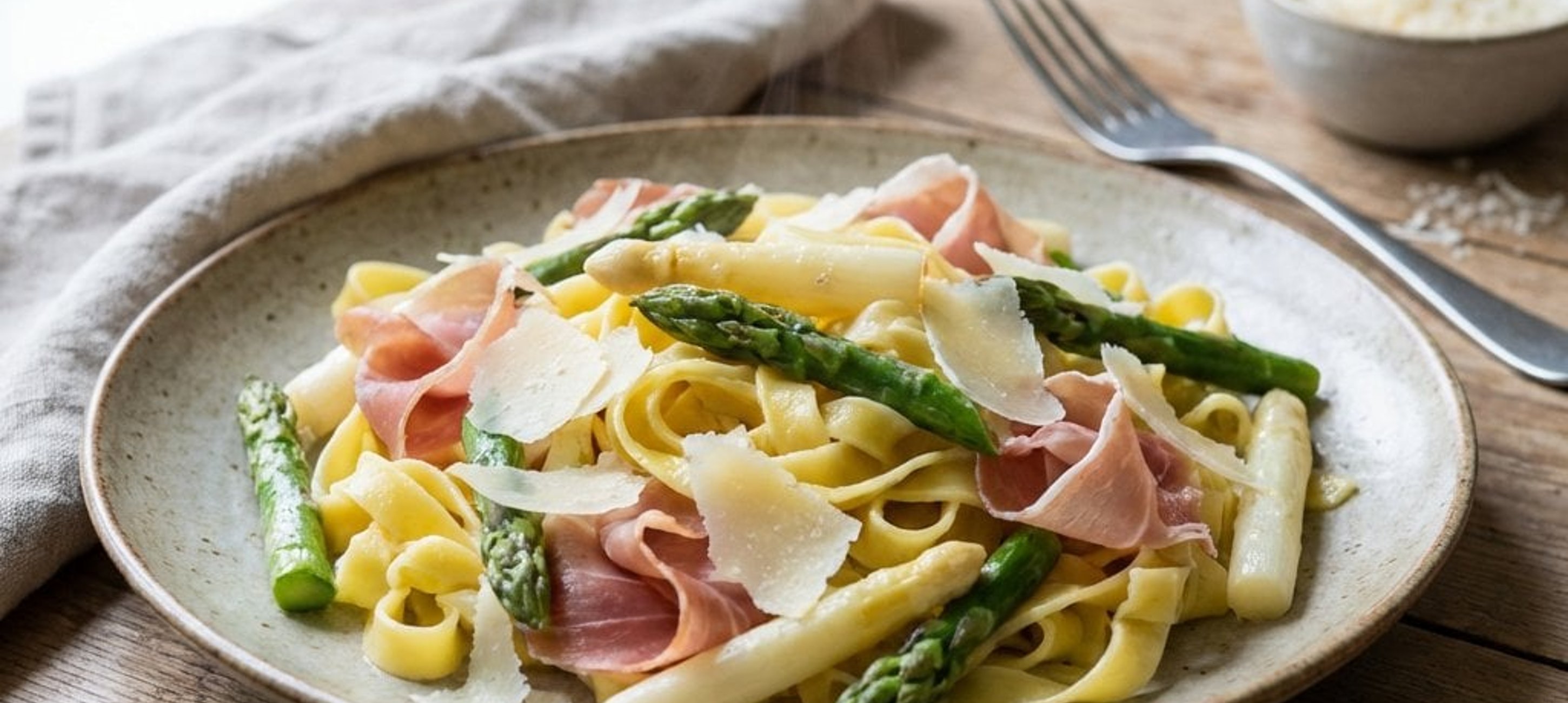 - 3In einer großen Pfanne Butter und Olivenöl erhitzen. Den Knoblauch fein hacken und kurz darin andünsten. Die Spargelstücke hinzufügen und leicht anbraten. Dann die Tagliatelle und einen Schuss des beiseite gestellten Nudelwassers dazugeben und alles gut vermengen.