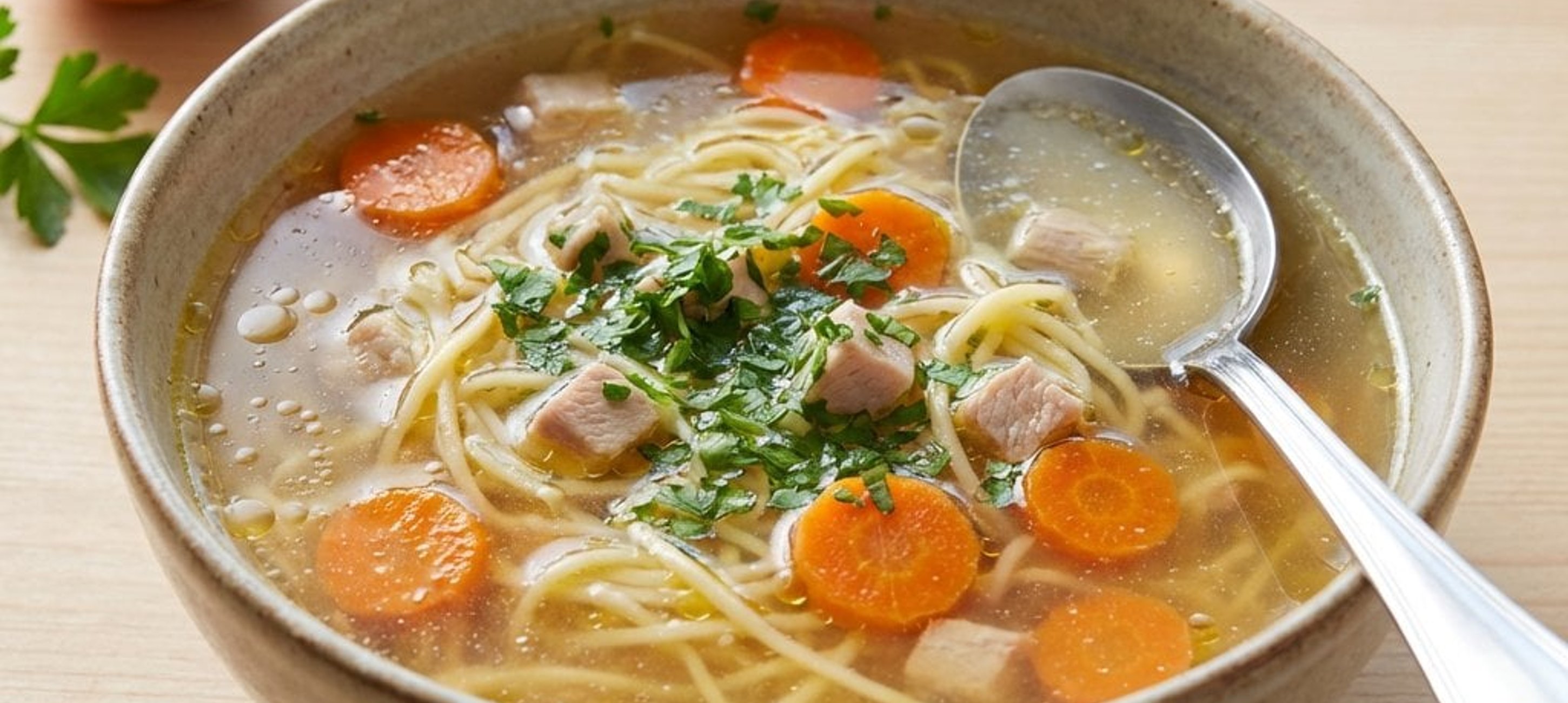 - 2Die Eiernudeln in einem separaten Topf mit reichlich Salzwasser bissfest kochen und abgießen. Den fertigen Sud durch ein feines Sieb in einen sauberen Topf abseihen. Mit Salz und Pfeffer abschmecken und nochmals kurz aufkochen. Fleisch und Gemüse wieder hinzufügen. Vor dem Servieren die frische Petersilie waschen, fein hacken und über die Suppe streuen.