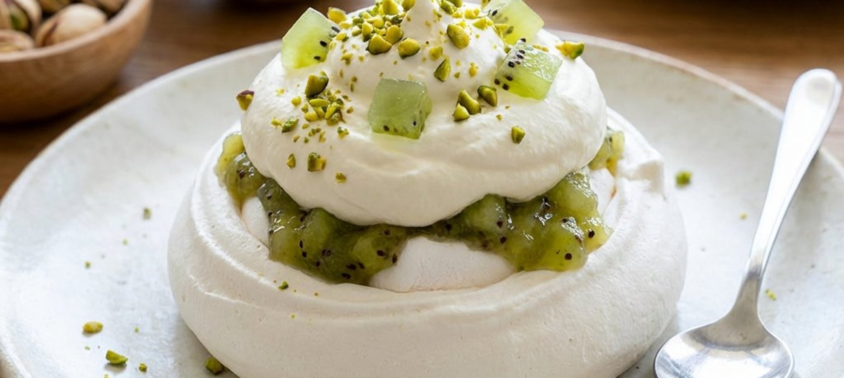 - 1Schlagen Sie die Sahne steif. Geben Sie zuerst etwas Kiwi-Kompott in die Vertiefung der Baiser-Böden. Darauf die Schlagsahne verteilen und mit den Gelee-Würfeln, frischen Kiwi-Scheiben (ca. 100 g) und gehackten Pistazien garnieren.