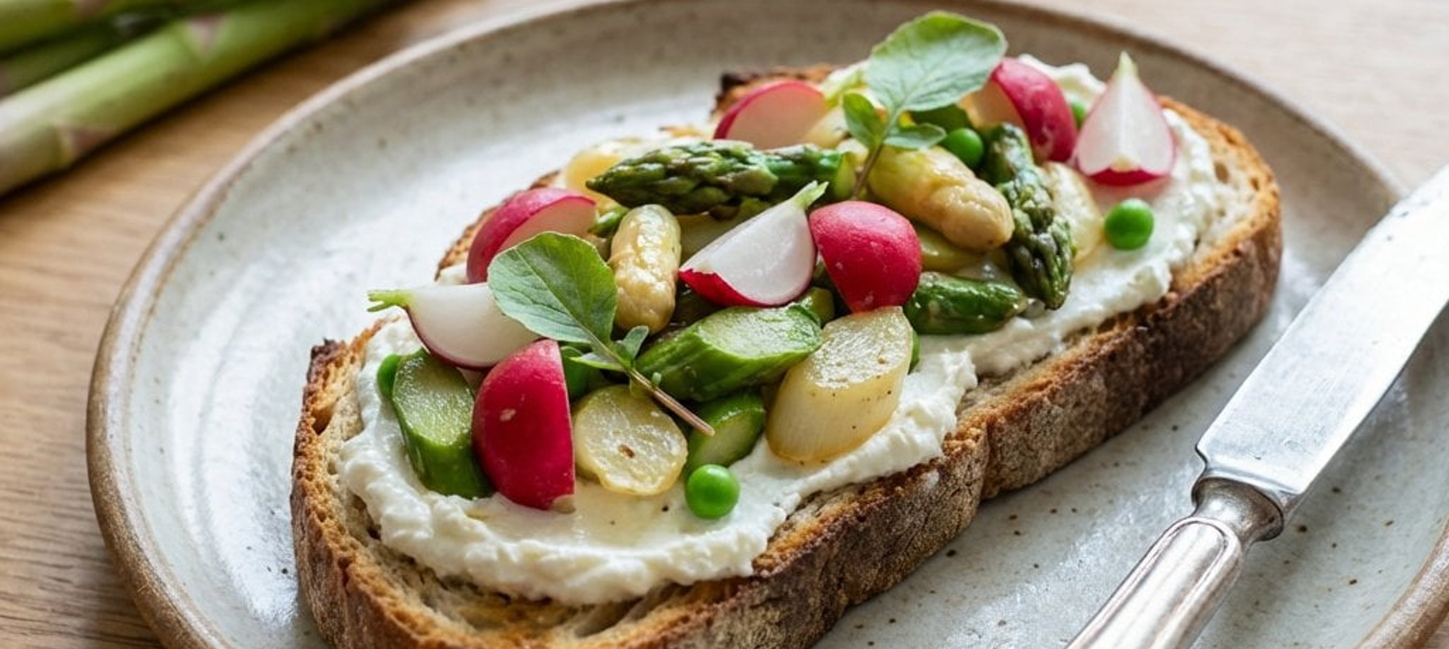 Ein echter Frühlingsgruß auf dem Teller! Wenn Sie keinen Grill im Ofen haben, können Sie das Brot auch einfach im Toaster rösten und das Gemüse in der Pfanne bei mittlerer Hitze ca. 5-7 Minuten weich dünsten.
