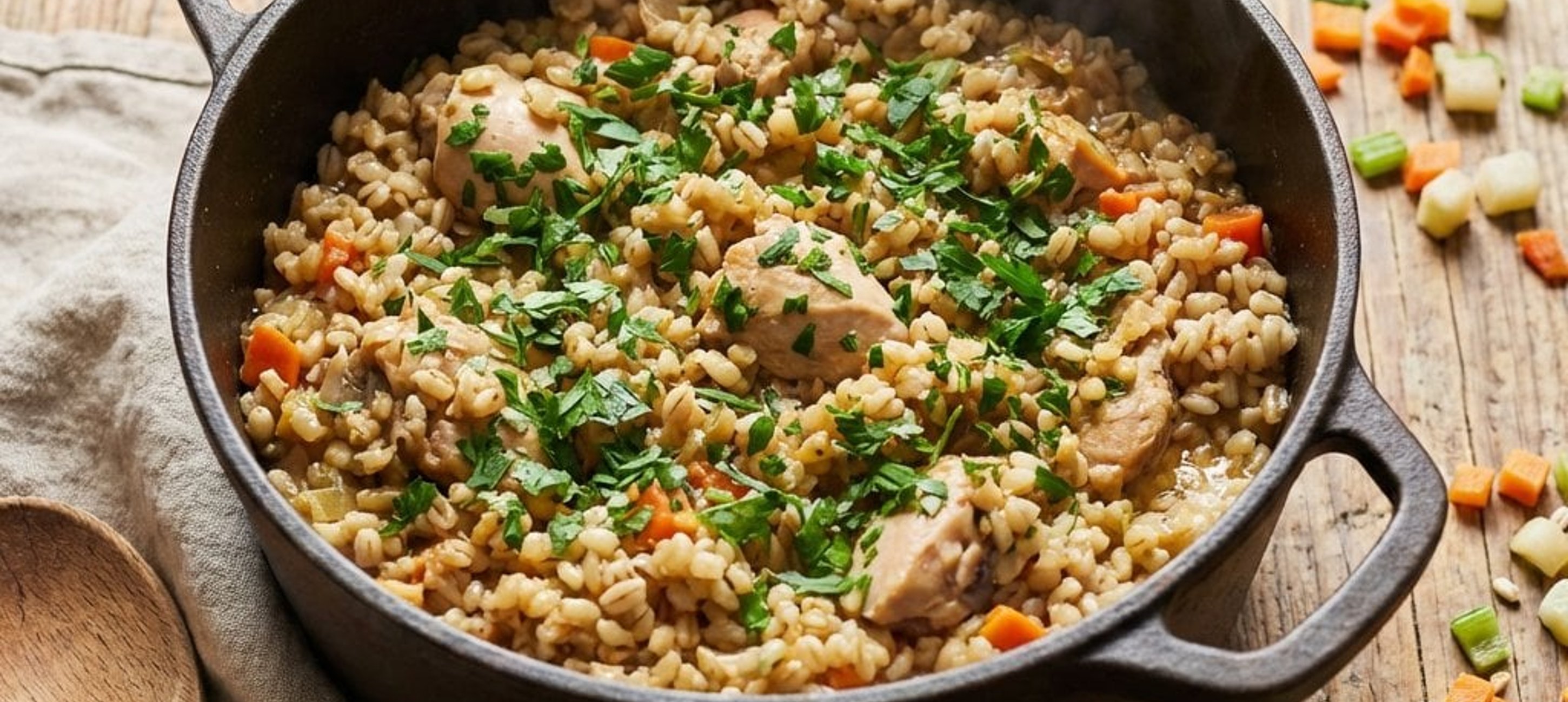 - 4Rühren Sie die Gerstengraupen, die Hühnerbrühe und die stückigen Tomaten unter. Schmecken Sie alles mit Salz und Pfeffer ab. Legen Sie die Hähnchenschenkel wieder obenauf.