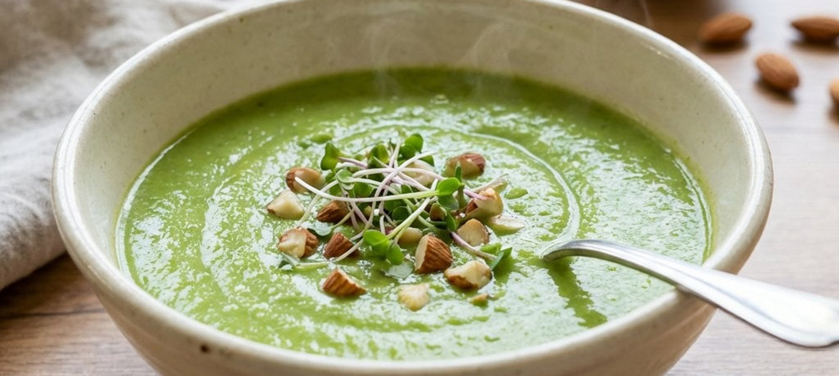 - 5Die Suppe in Schalen anrichten, mit frischen Radieschensprossen garnieren und mit gehackten Mandeln bestreuen.