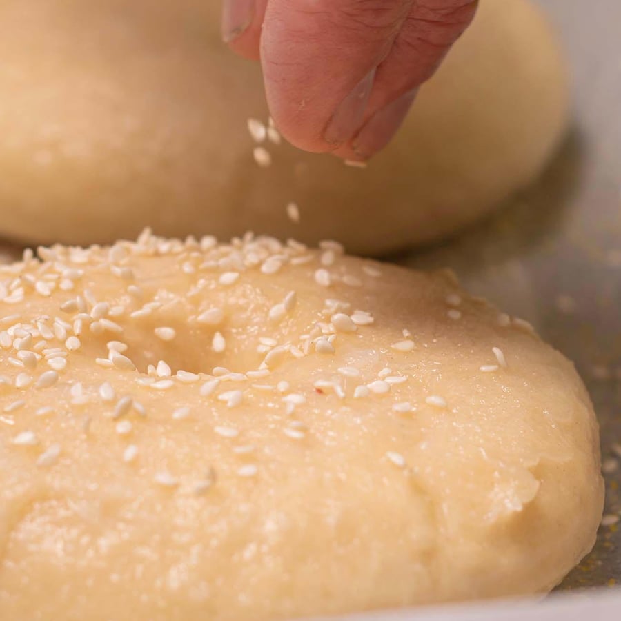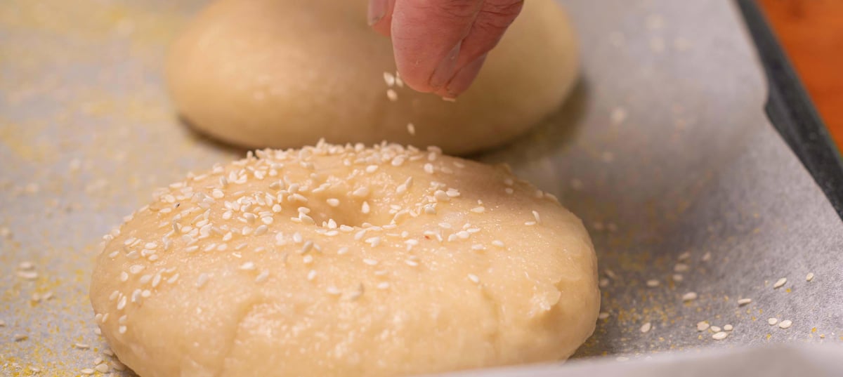 - 5Bagels herausnehmen, gut abtropfen lassen und wieder auf das Backblech legen. Mit etwas Haferdrink bestreichen und nach Belieben mit Sesam und Kürbiskernen toppen.