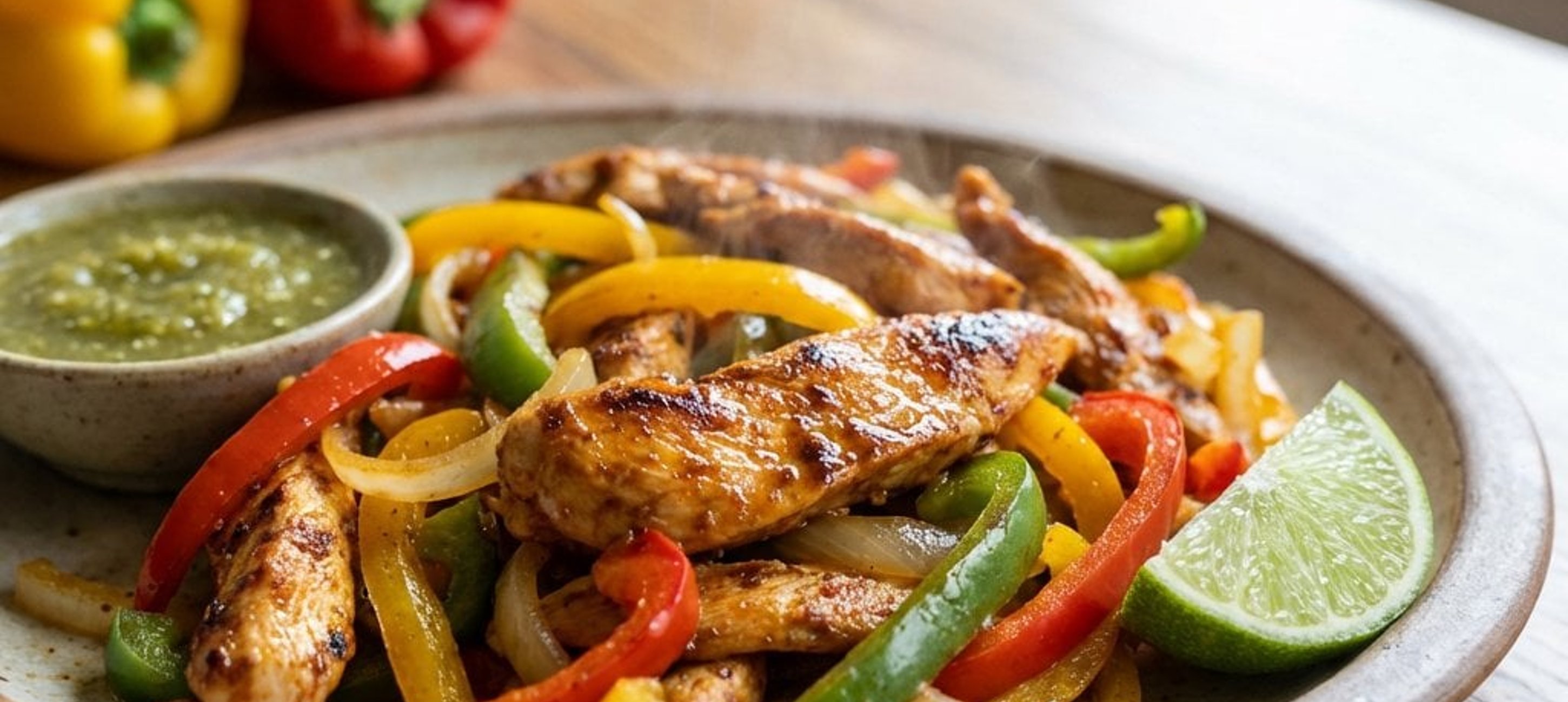 Servieren Sie die Fajitas klassisch in warmen Tortillas mit einem Klecks Salsa Verde und nach Belieben mit etwas saurer Sahne oder Avocado.