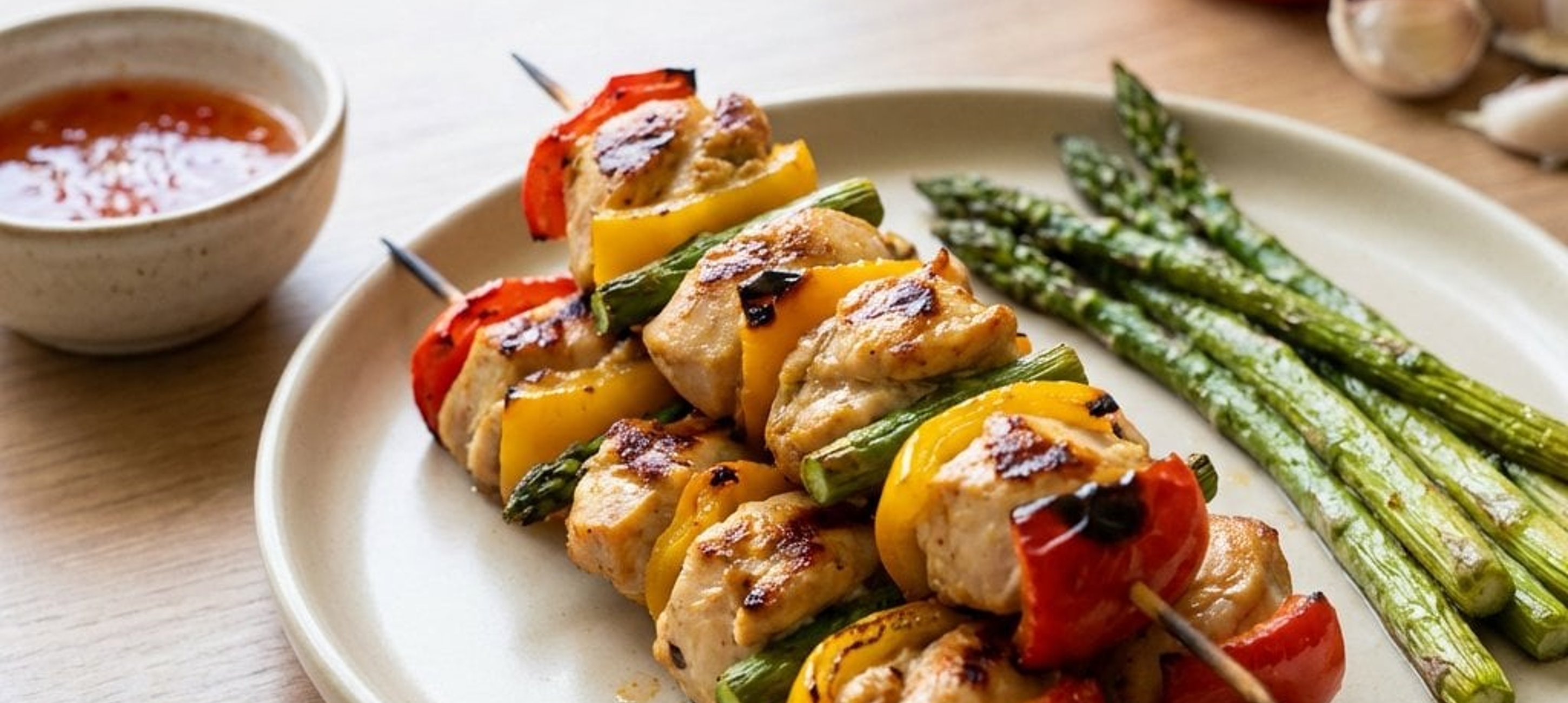 - 1Abwechselnd Fleisch, Paprika und die kurzen Spargelstücke auf Schaschlikspieße stecken. Die Spieße auf ein Backblech legen und ca. 200 ml Wasser angießen. Im vorgeheizten Backofen bei 200 °C (Ober-/Unterhitze) etwa 20 Minuten garen.