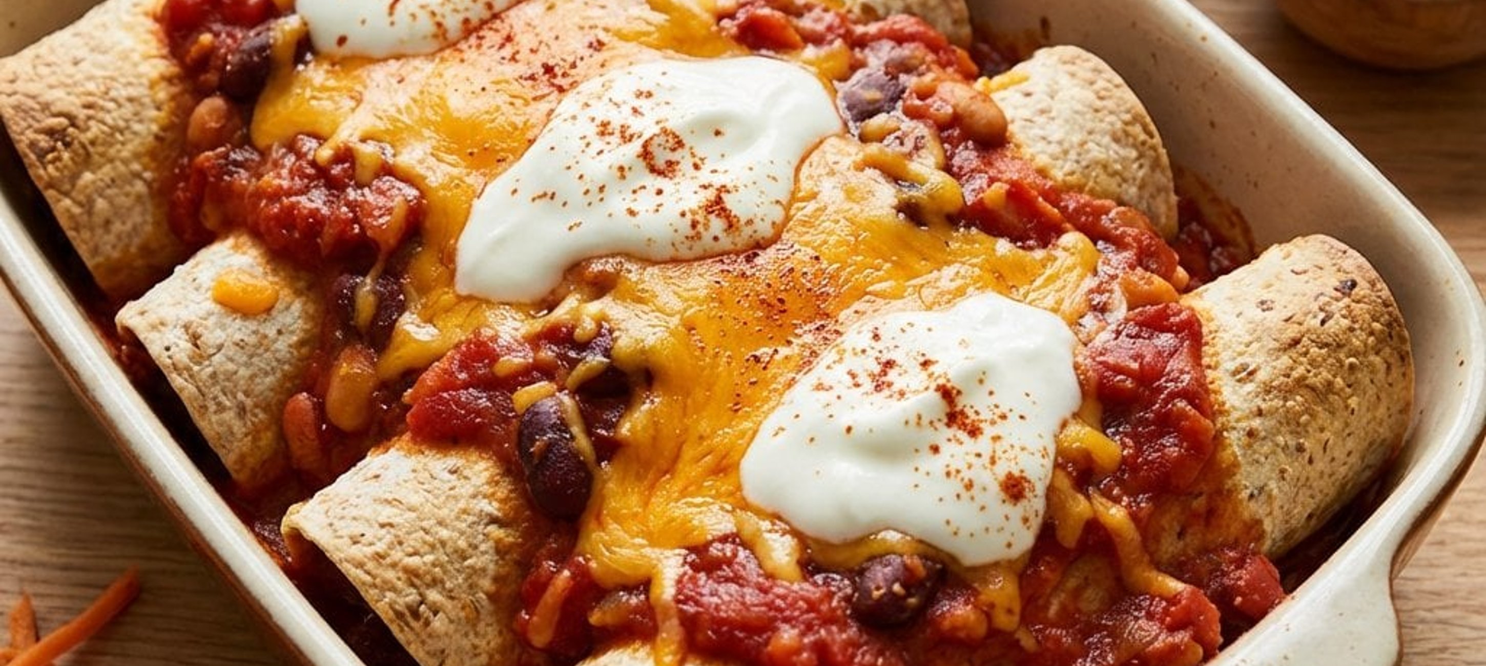 - 1Den Ofen auf 250 °C vorheizen. Eine große Auflaufform mit etwas von der Bohnenmischung bestreichen. Jede Tortilla mit ein paar Esslöffeln der Füllung belegen, die Enden einschlagen und fest aufrollen. Die Rollen mit der Nahtstelle nach unten in die Auflaufform legen. Die restliche Füllung gleichmäßig darüber verteilen.