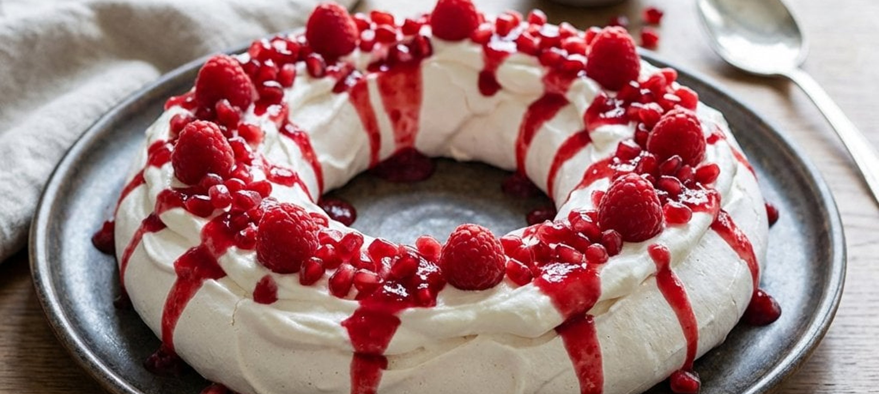 - 1Den abgekühlten Pavlova-Kranz mit der Himbeersauce beträufeln und großzügig mit den Granatapfelkernen bestreuen. Servieren und genießen!