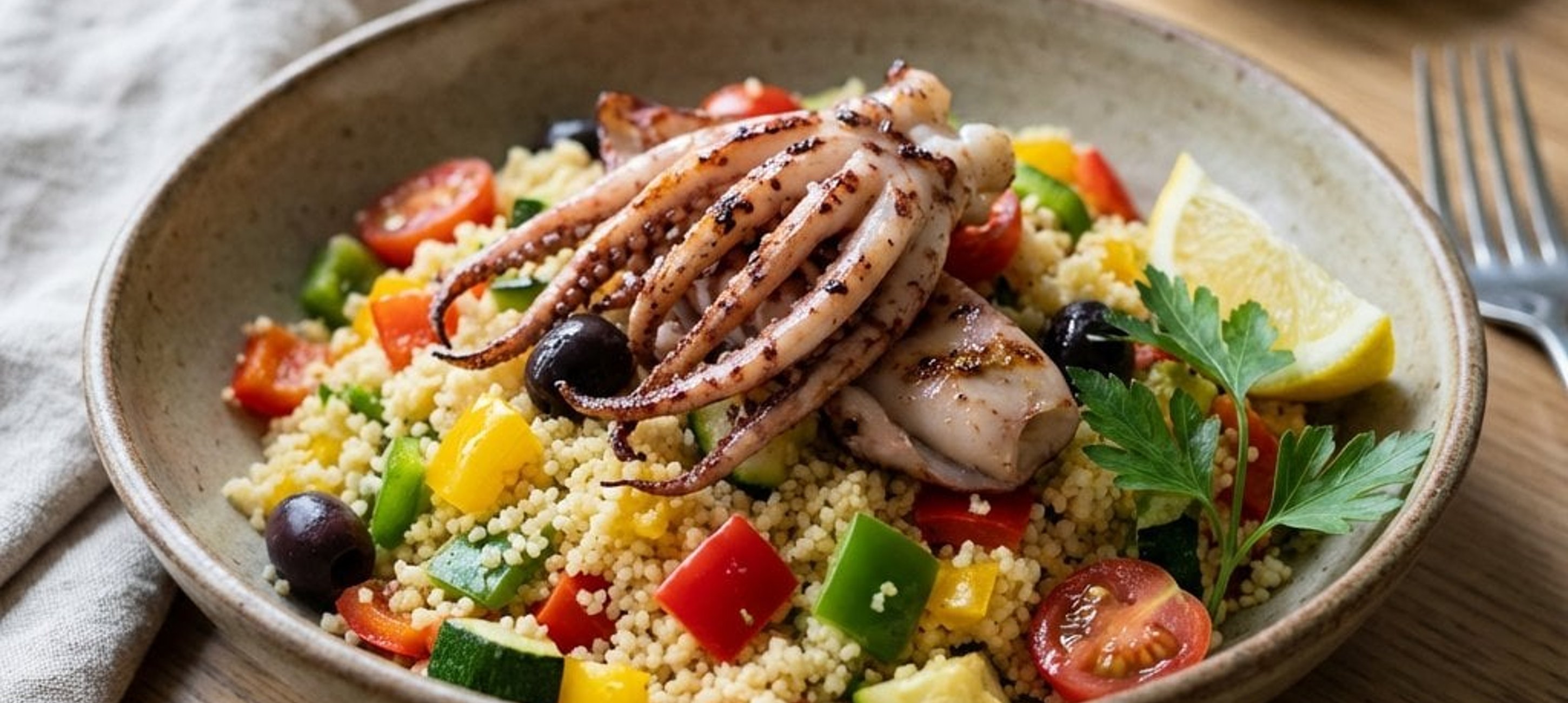 - 4Zum Servieren den Couscous auf Tellern anrichten, den Salat-Mix darauf verteilen und das gebratene Gemüse mit den Tintenfischstücken darübergeben. Mit Zitronensaft und dem restlichen Olivenöl beträufeln.