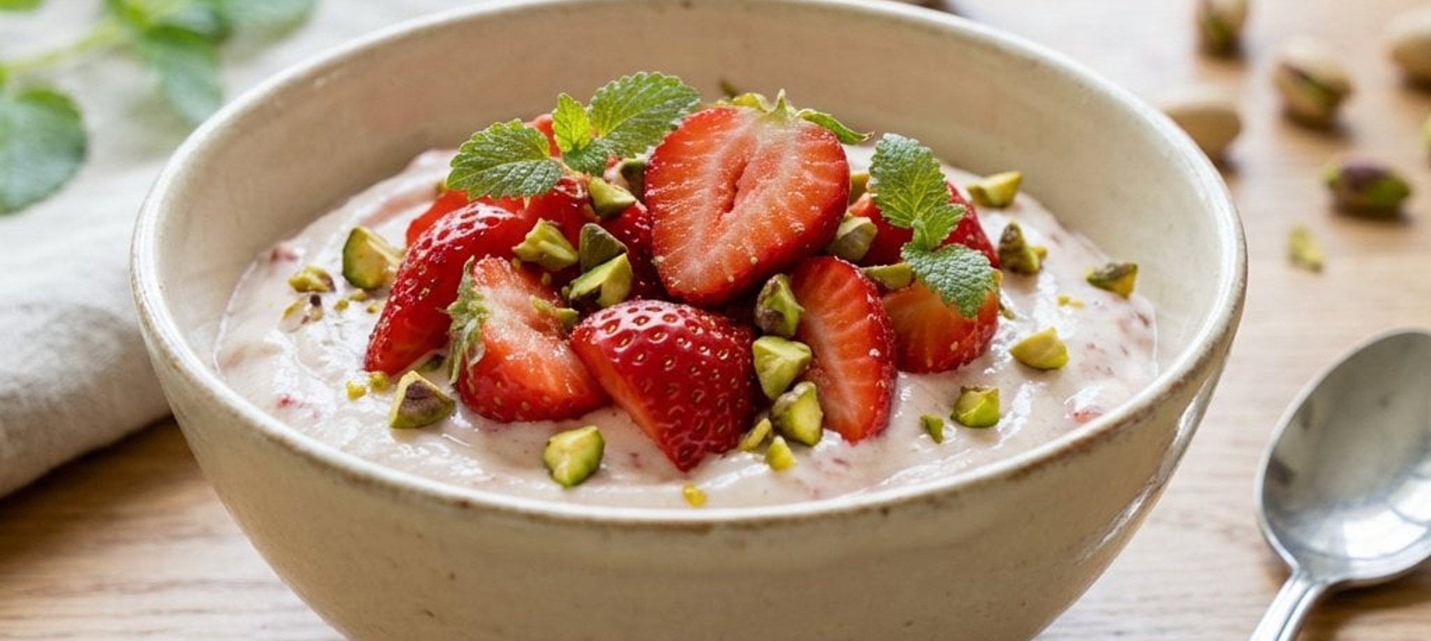 - 3Die fertige Erdbeercreme in Schalen oder tiefe Teller füllen. Mit den beiseitegelegten Erdbeerscheiben, gehackten Pistazien and frischen Zitronenmelisseblättern garnieren. Nach Belieben mit einem Klecks Sahne servieren.