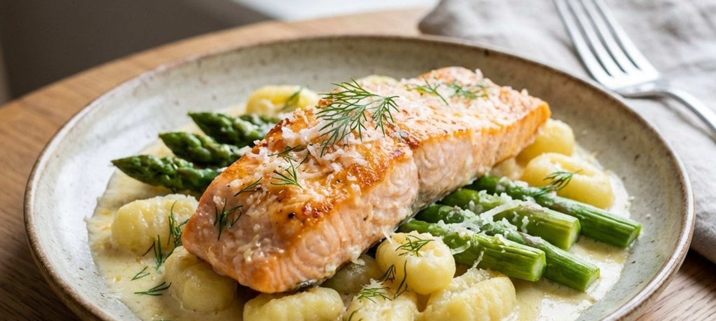 - 8Die cremigen Gnocchi zusammen mit dem gebackenen Lachs servieren.