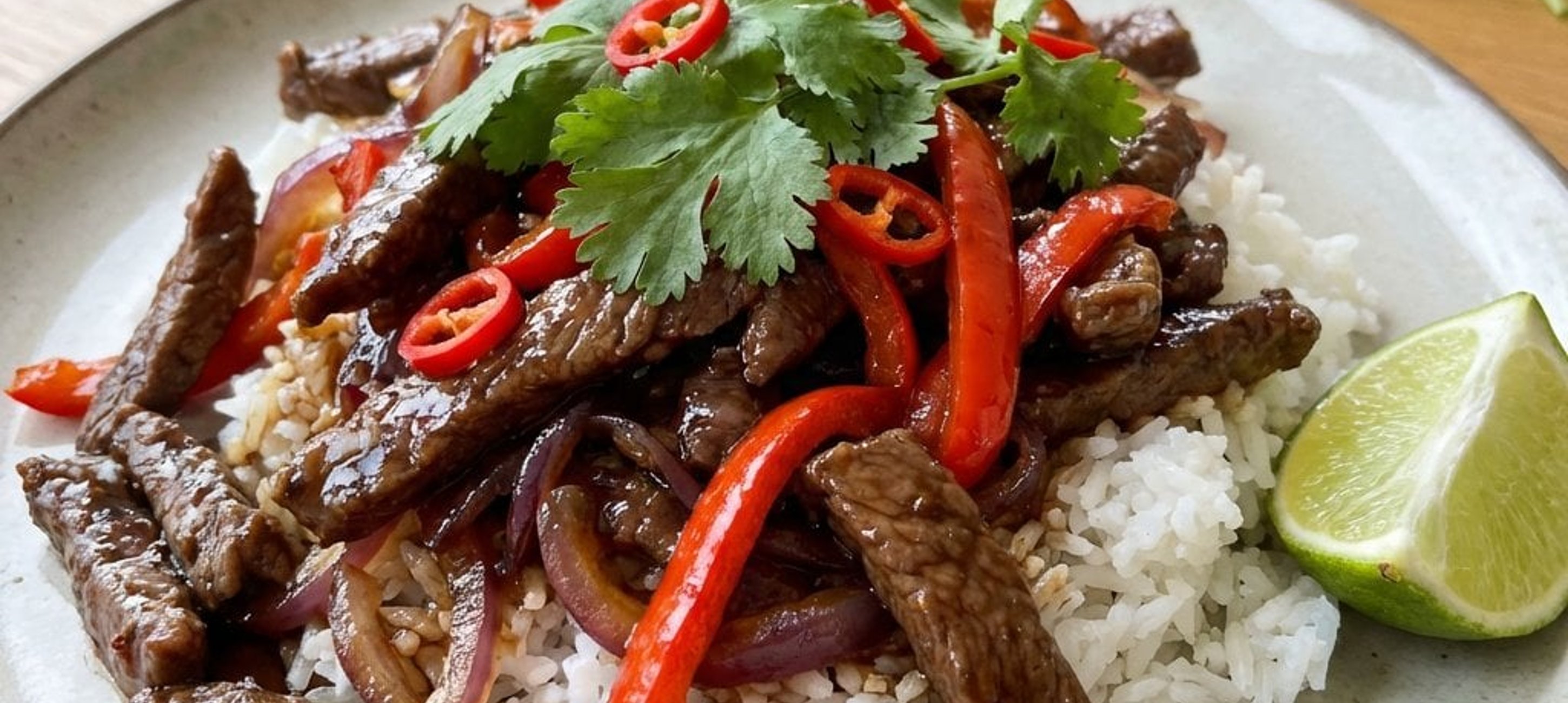 - 3Die Rindfleischstreifen zusammen mit dem Reis servieren. Mit frischem Koriander bestreuen und mit Limettenspalten garnieren.