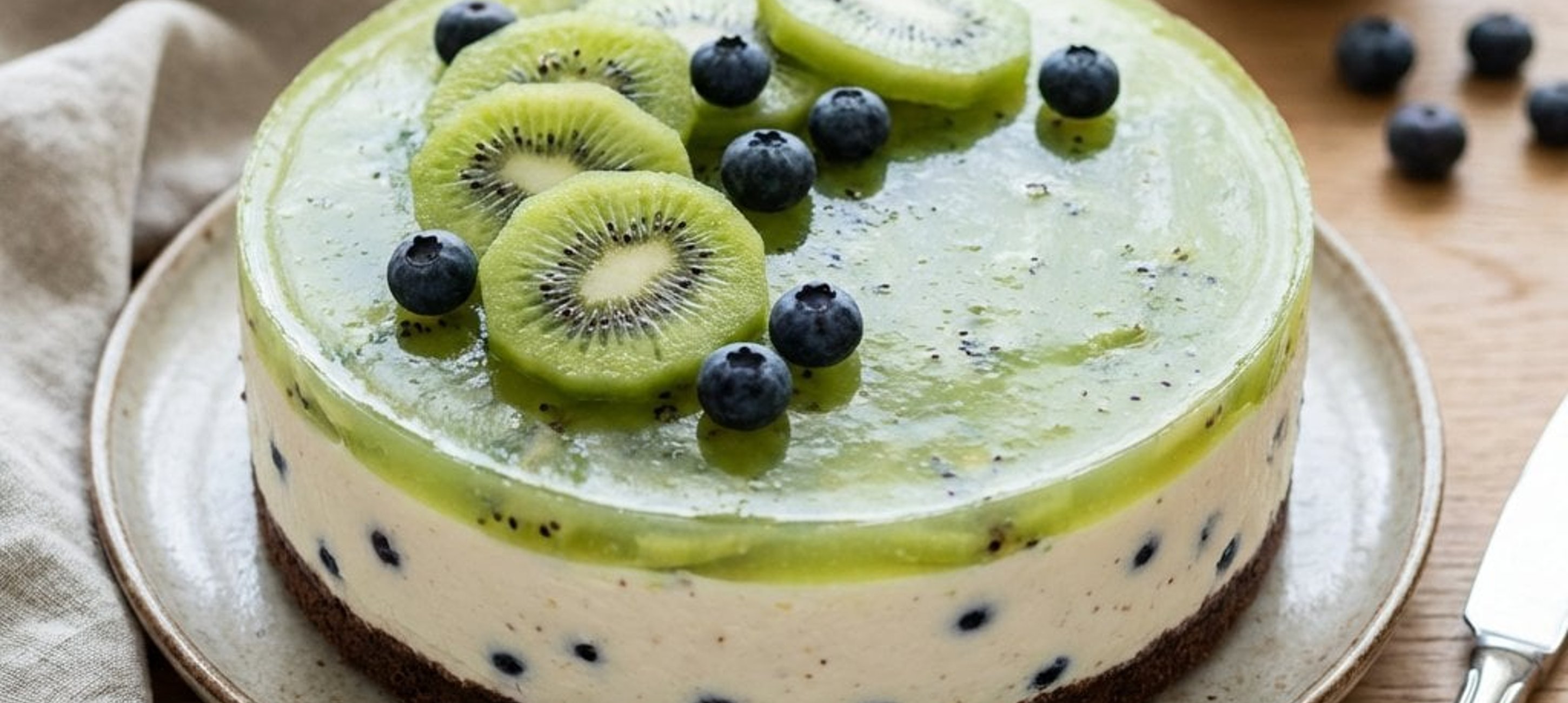 - 2Gießen Sie das Kiwi-Gelee vorsichtig auf die bereits fest gewordene Quarkmasse und stellen Sie den Kuchen für weitere Stunden in den Kühlschrank. Lösen Sie den Cheesecake mit einem scharfen Messer aus der Form. Nach Belieben mit frischen Kiwischeiben, Limetten und Heidelbeeren dekorieren.