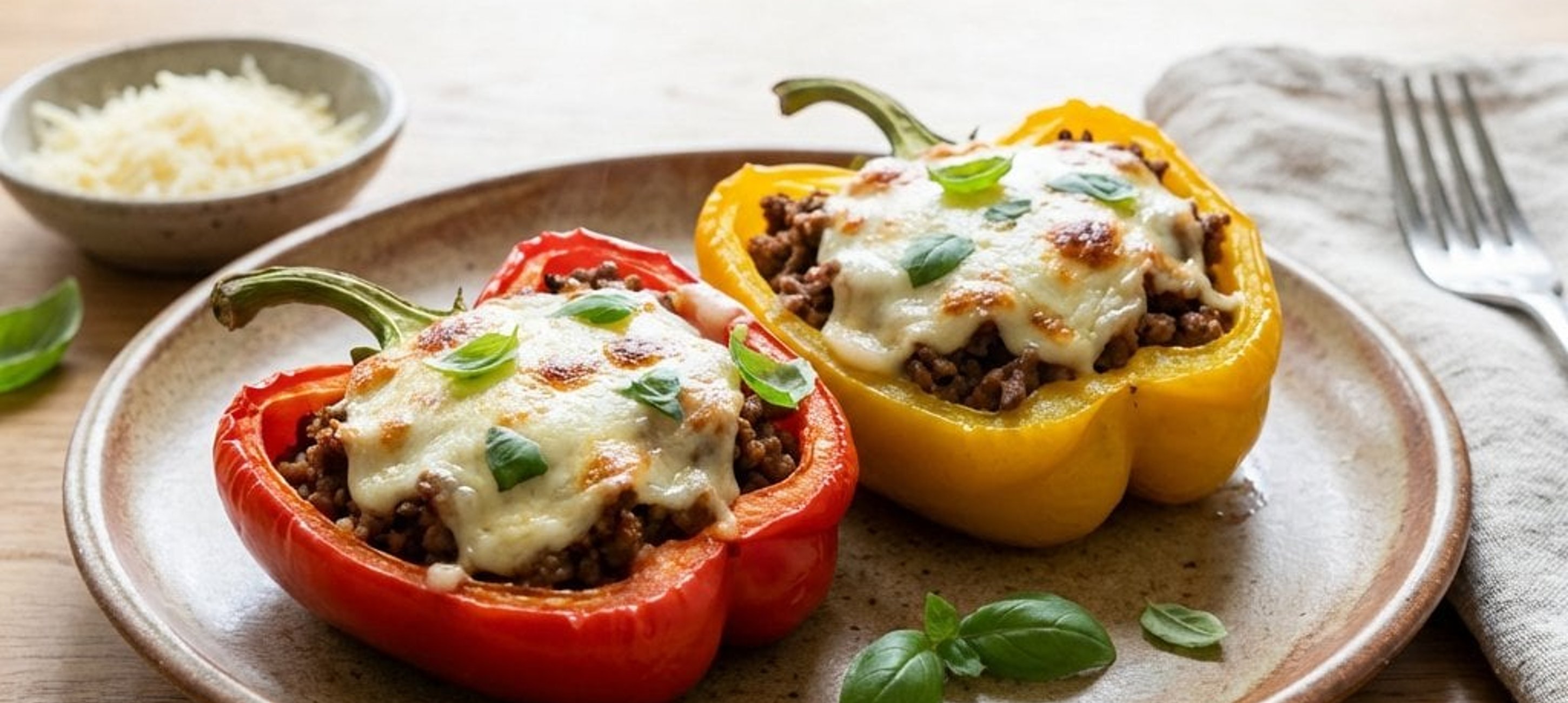 - 2Das Blech kurz aus dem Ofen nehmen, die Paprikas mit dem grob geriebenen Mozzarella bestreuen und für weitere 10 Minuten bei 160 °C fertig backen, bis der Käse geschmolzen ist.